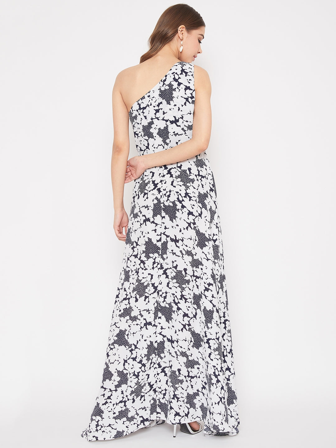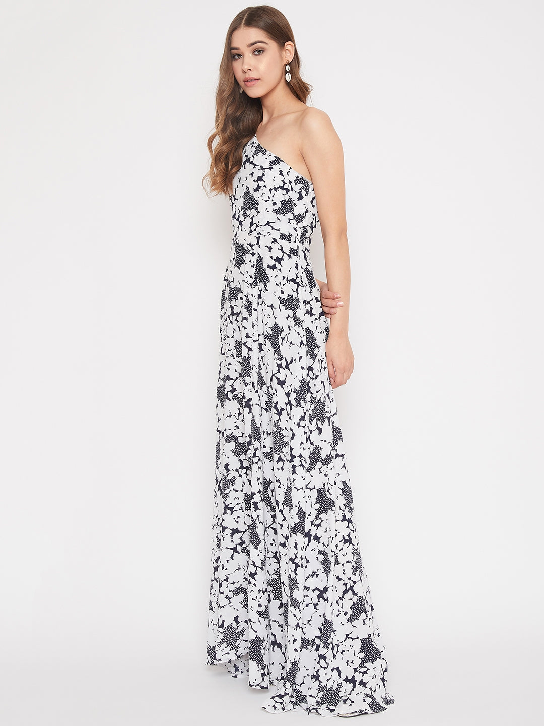 Berrylush Women Black & White Floral Printed One-Shoulder Flared Maxi Dress