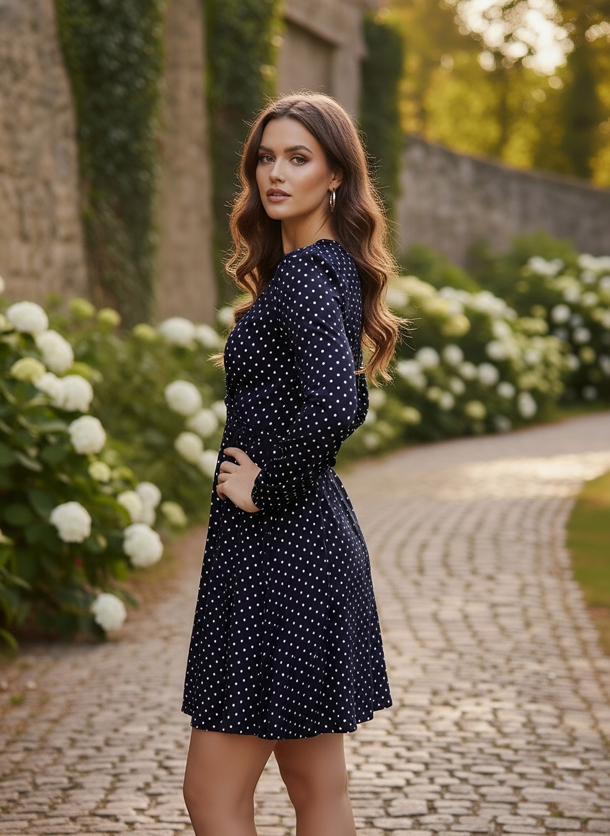 Glam up your wardrobe with retro fashion essence by adding this classy Navy Blue Polka Dot Printed V-Neck Waist Tie-Up Fit & Flare Wrap Mini Dress from Berrylush. The polka dot print gives a splendid appearance to this dress. Comes with a warped shape to highlight the natural curve and support a convenient fit. The long sleeves design of this dress makes your arms appear attractive and also provides warmth during cold weather. Also, the V-neckline elegantly defines the neck area and presents a casual look. Spun with crepe polyester fabric to keep you comfortable and cosy throughout the day. The fit and flare feature adds a lustrous sheen to this dress. You can complete the look by pairing this beautiful wrap dress with high heels and a sling bag.