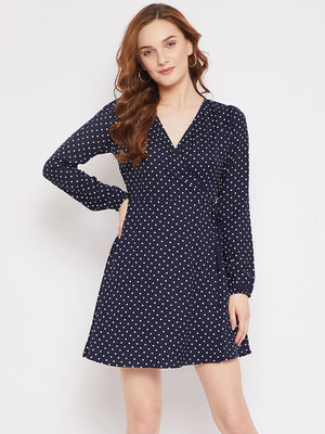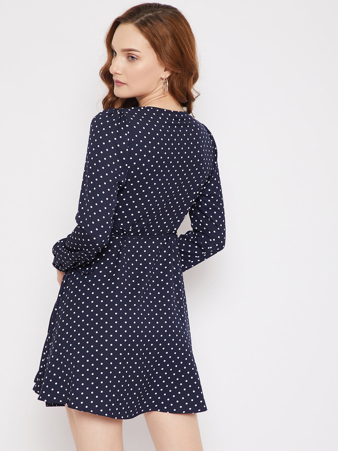 Berrylush Women Navy Blue Polka Dot Printed V-Neck Waist Tie-Up Fit & Flare Wrap Mini Dress