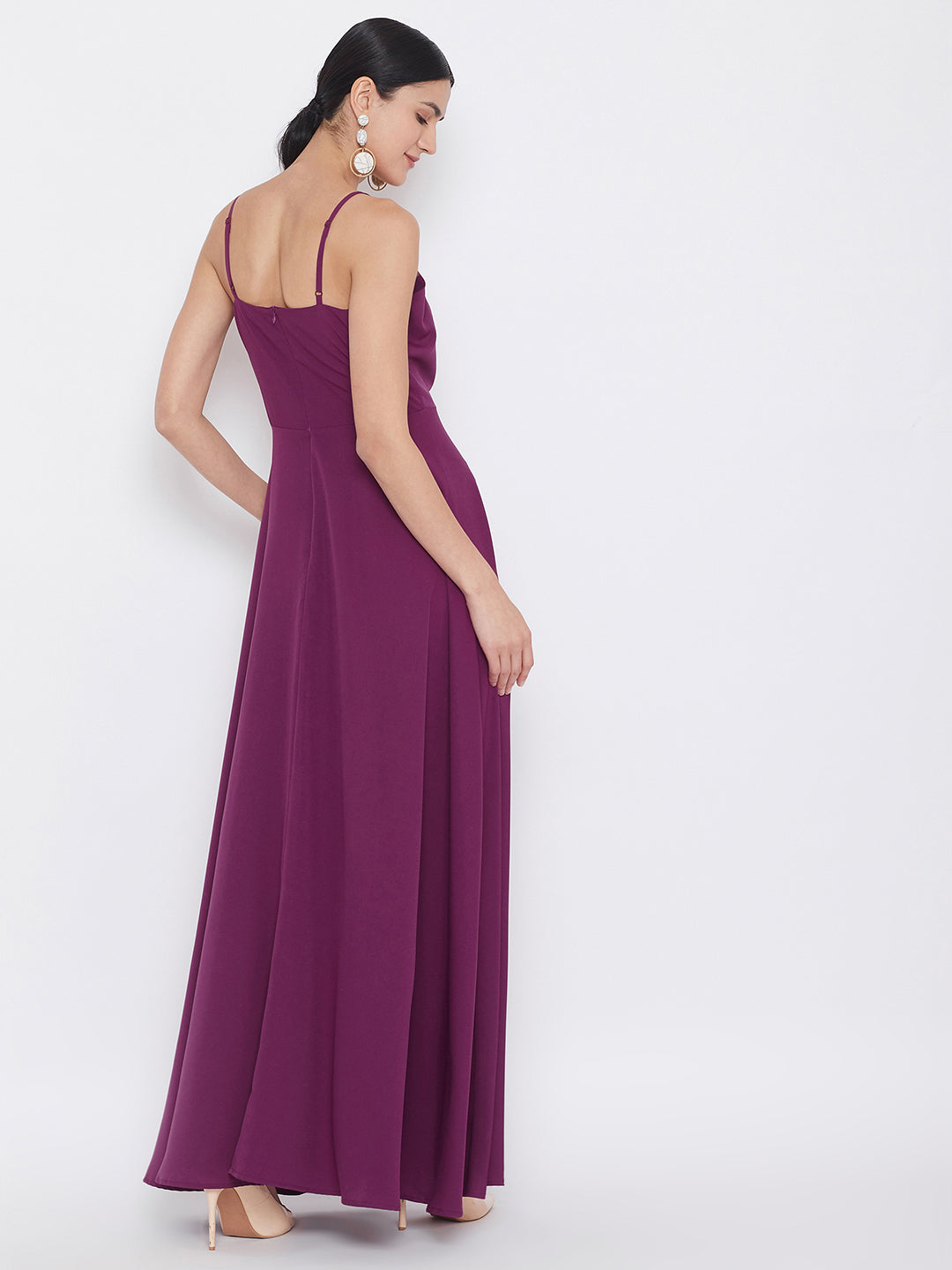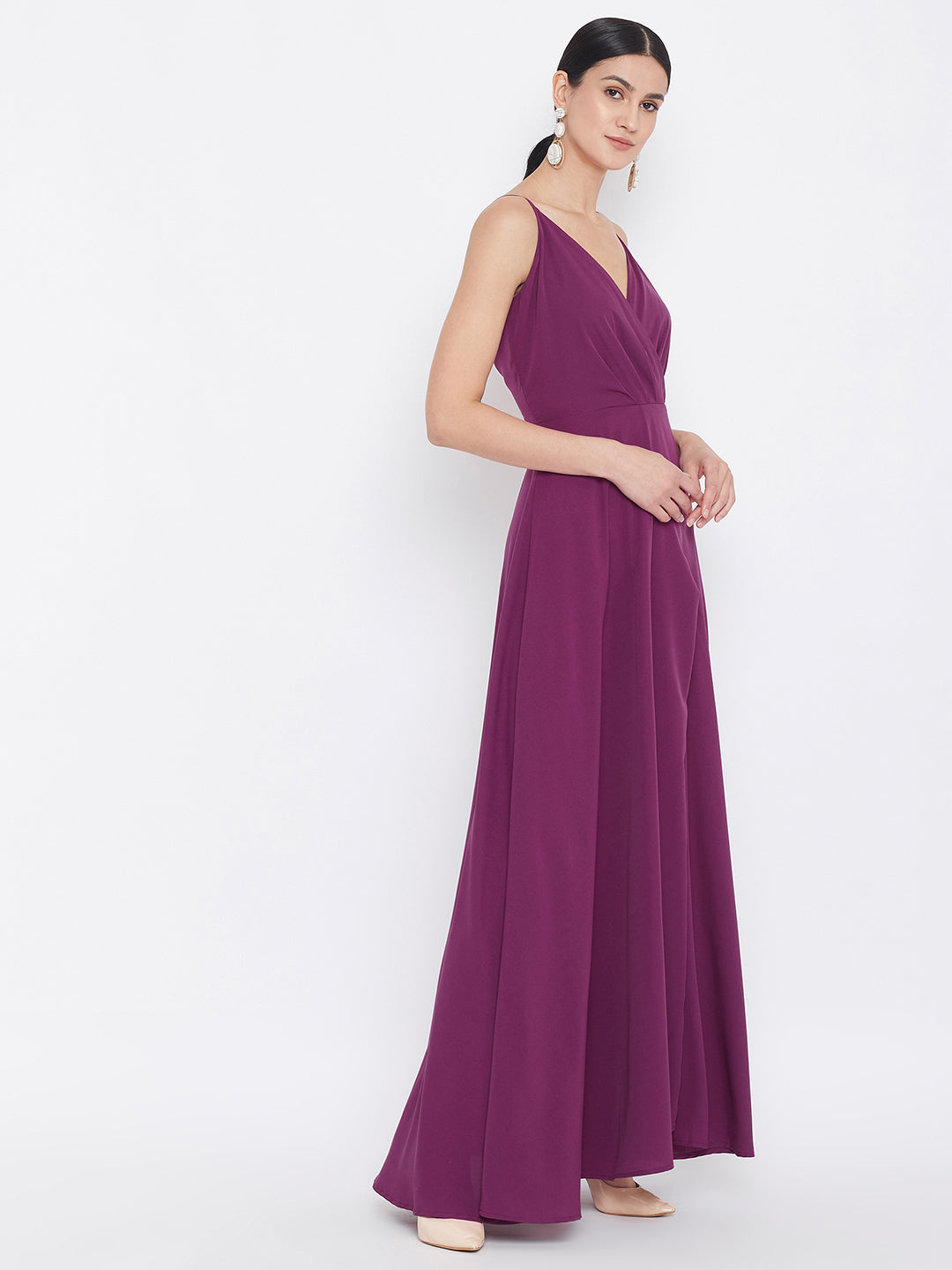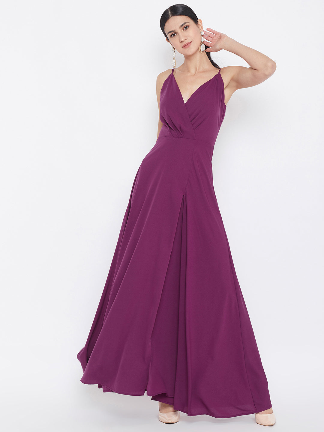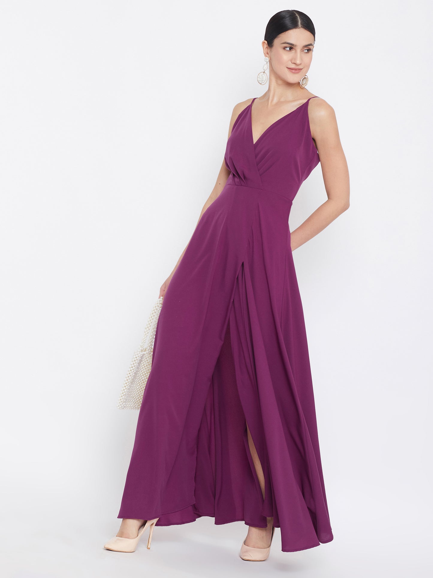 Give fuel to your fashion-forward sense with this Solid Dark Purple V-Neck A-Line Maxi Dress from Berrylush and an unfading grace to the party event. Seamless strappy shoulders with clips for the adjustment that will match your mood your comfort level. The slouchy busts with full coverage get more style punch with the attractive V neckline. And the back part gets a cheeky squared back that flaunts your overall back outline. From the banded waistline, this dress gets a lengthy flare that falls to the feet with engaging designs of layers that carry a bold front slit for matching your fashion needs. Match this lavish outfit with high-heeled stilettos and an embellished sling bag for a chic look. Buy this dress from Berrylush to fill magic to the approaching event.
