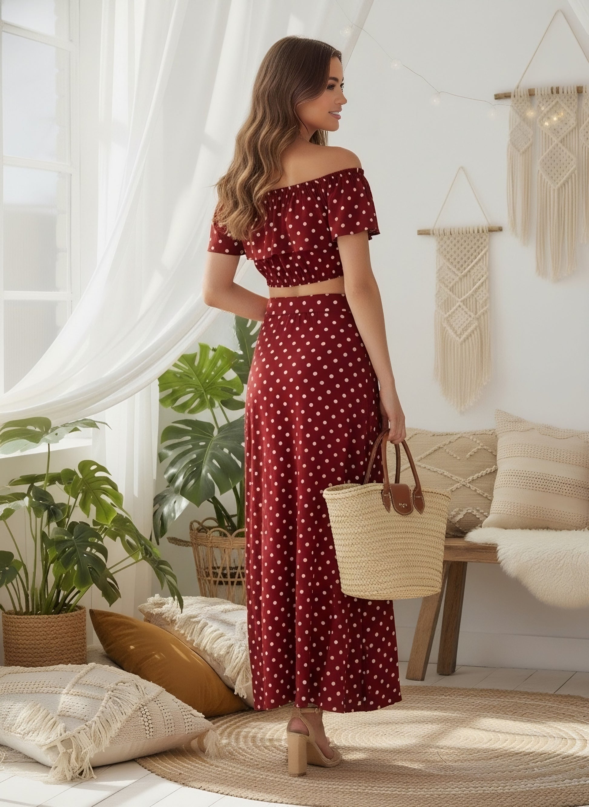 Bring a style that becomes immortal and irresistible by wearing this Red Polka Dot Printed Off-Shoulder Co-Ord Maxi Dress from Berrylush. Features amazing polka dot print to give you a never-fading look. A petite crop top with a seductive maxi skirt is going to be the best outfit for summer trips. Ruffle front design that covers the bust and continues over the arms with a floaty style. The torso becomes alluring with the banded waistline and the second half of this co-ord set is another element that adds up the super sassy punch to your overall appearance. With the gorgeous wrap pattern & the seductive slit, your every step going to illuminate the supermodel inside you. Match this maxi dress with strappy heels and dazzling jewellery for a charming look.