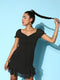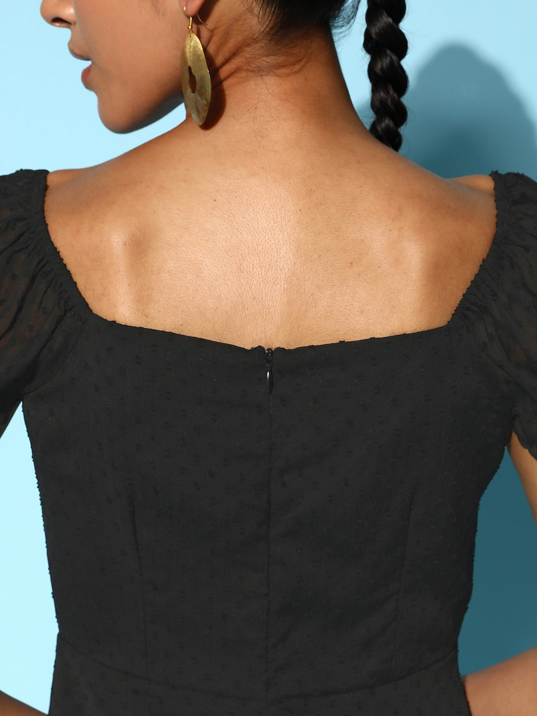 Black is all you need to get the free-spirited and confident aura just like this majestic Solid Black Dobby Weave Sweetheart Neck Georgette Flounce Hem Ruffled A-Line Mini Dress from Berrylush. Spun from georgette polyester fabric to offer this dress a breathable feel with textures touch and semi-sheer detailing. Short-puff sleeves add a tinge of retro charm to this dress with comfortable movements to your arms. Also, the concealed zip closure lends this dress a refined sheen with easy to wear style. You can complete your casual look fabulously by wearing this mini dress with block heels, classy silver jewellery, and a small handbag.