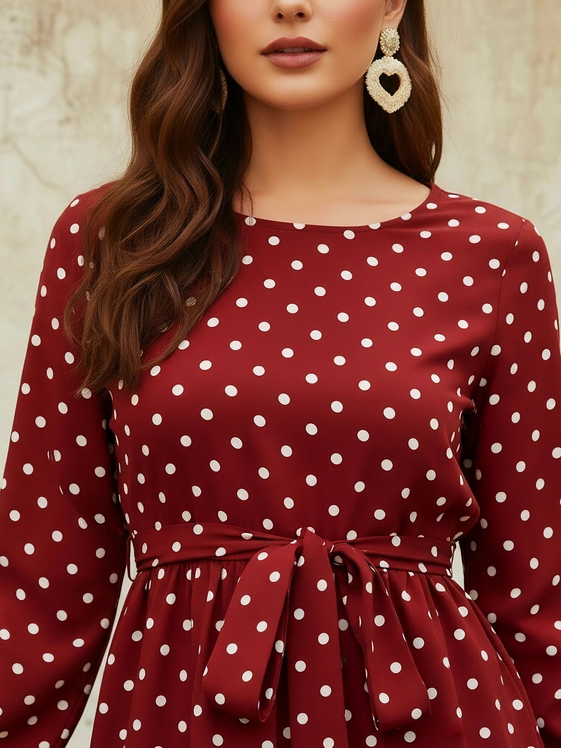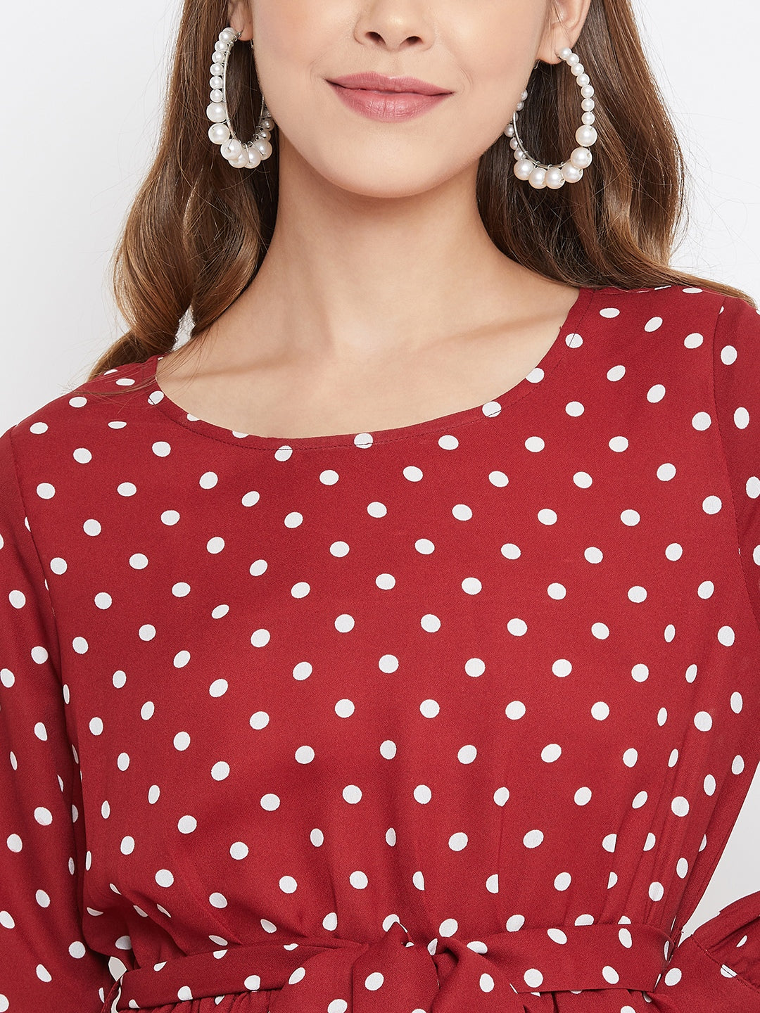 This autumn creates a Barbie-like look with this Red Polka Dot Printed Round-Neck Tiered Fit & Flare Maxi Dress from Berrylush. With the regular long sleeves, your arms appear elegant & neat and the polka dot all over the dress sustains the charm of a youthful aura. The free-flowing maxi length enhances the feminine aura to another level and with the red colour, your appearance gets a unique element of style & passion. The tiered detailing decorates this dress into a scenery of a garden filled with butterflies. Match this chic dress with white sneakers, minimal beads jewellery, and a denim small purse for a charming look. Dress like a fashionista every time you go to a party this summer with Berrylush.