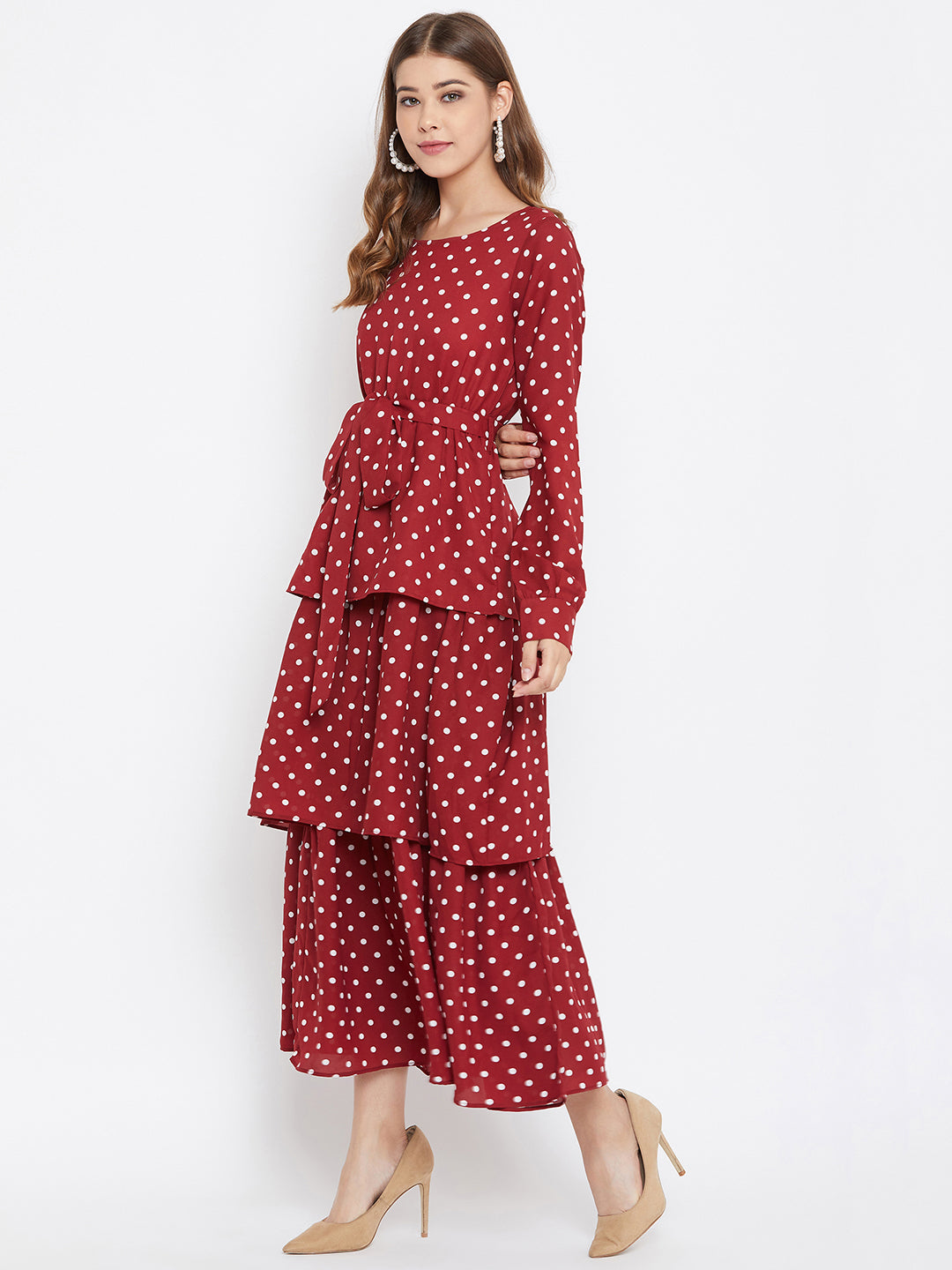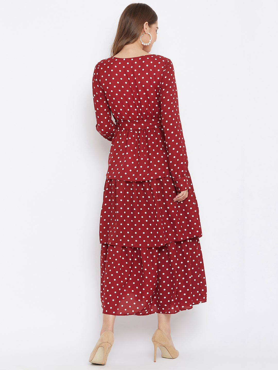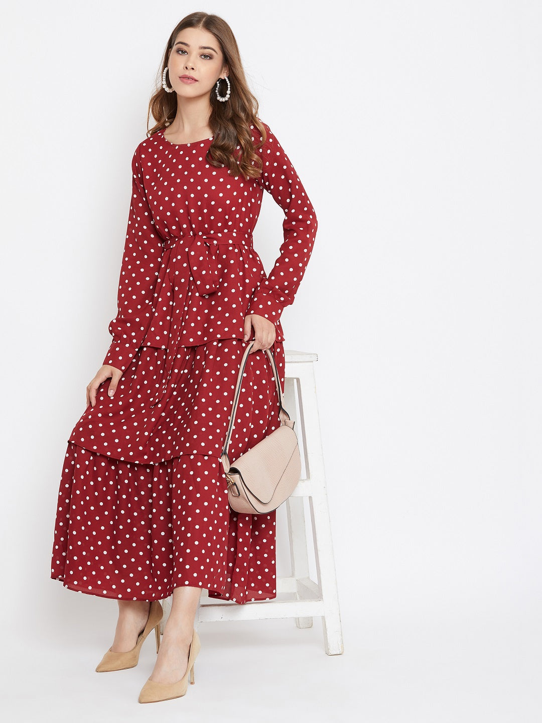 Berrylush Women Red Polka Dot Printed Round-Neck Tiered Fit & Flare Maxi Dress