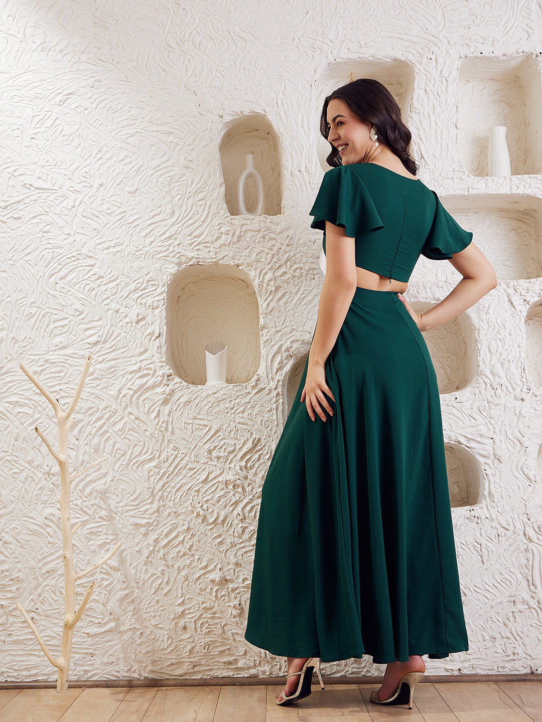 Showcase your unique party style this season by including this mesmerizing Solid Dark Green Round Neck Cut-Out Crepe Thigh-High Slit Fit & Flare Maxi Dress from Berrylush. Admired for its round neck design that gives an enchanting appeal to your beautiful neckline and collarbones. Fashioned with short-flared sleeves to lend your arms an appropriate coverage to keep them protected from UV rays. That's not all, the cutout detailing makes this maxi dress appear alluring and it also enables you to hold on to a trend-alert look. Pair this gorgeous maxi dress with pump heels, minimalistic silver jewellery, and a sling bag for a chic appeal.