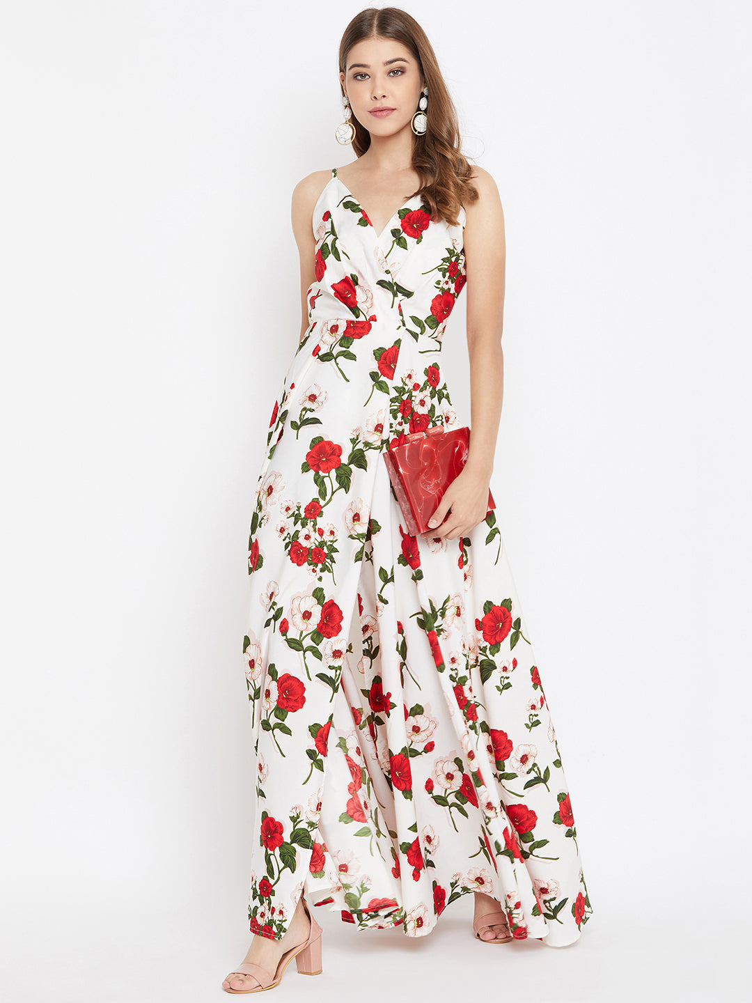 Berrylush Women White & Red Floral Printed V-Neck Thigh-High Slit Maxi Dress
