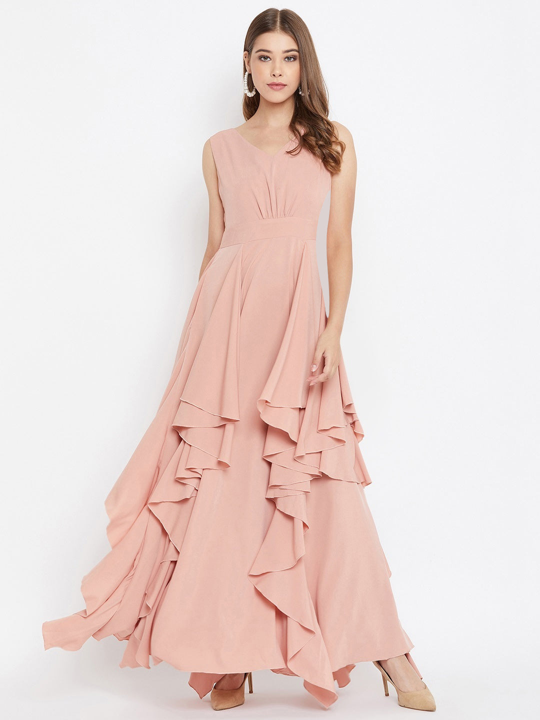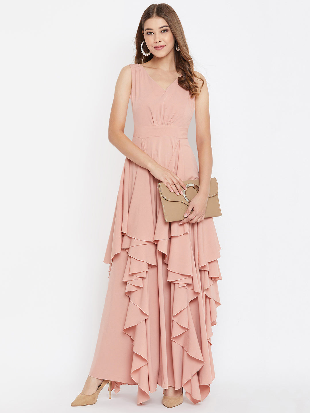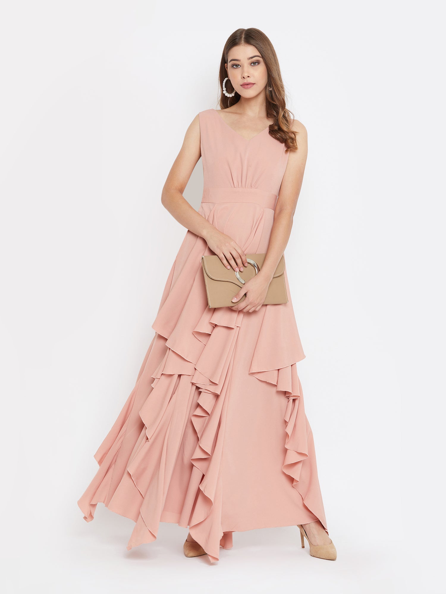 Like a fairytale look ethereal with this Solid Pink V-Neck Layered Maxi Dress from Berrylush. The faddish layered ruffles designed all over the dress make your look more captivating and charming. The neat finish over the armpit creates a beautiful appearance of your arms which make them look more toned. The chic square open-back design takes your style statement to another level, this maxi dress has a super supportive enclosed zip closure at the back for a secure and reliable fastening. The V-shaped neckline enhances the beauty of your collarbone and adds up another gorgeous element over your admirers. Pair this beautiful outfit with heeled stilettos and create an adorable fairy affair with this dress from Berrylush.