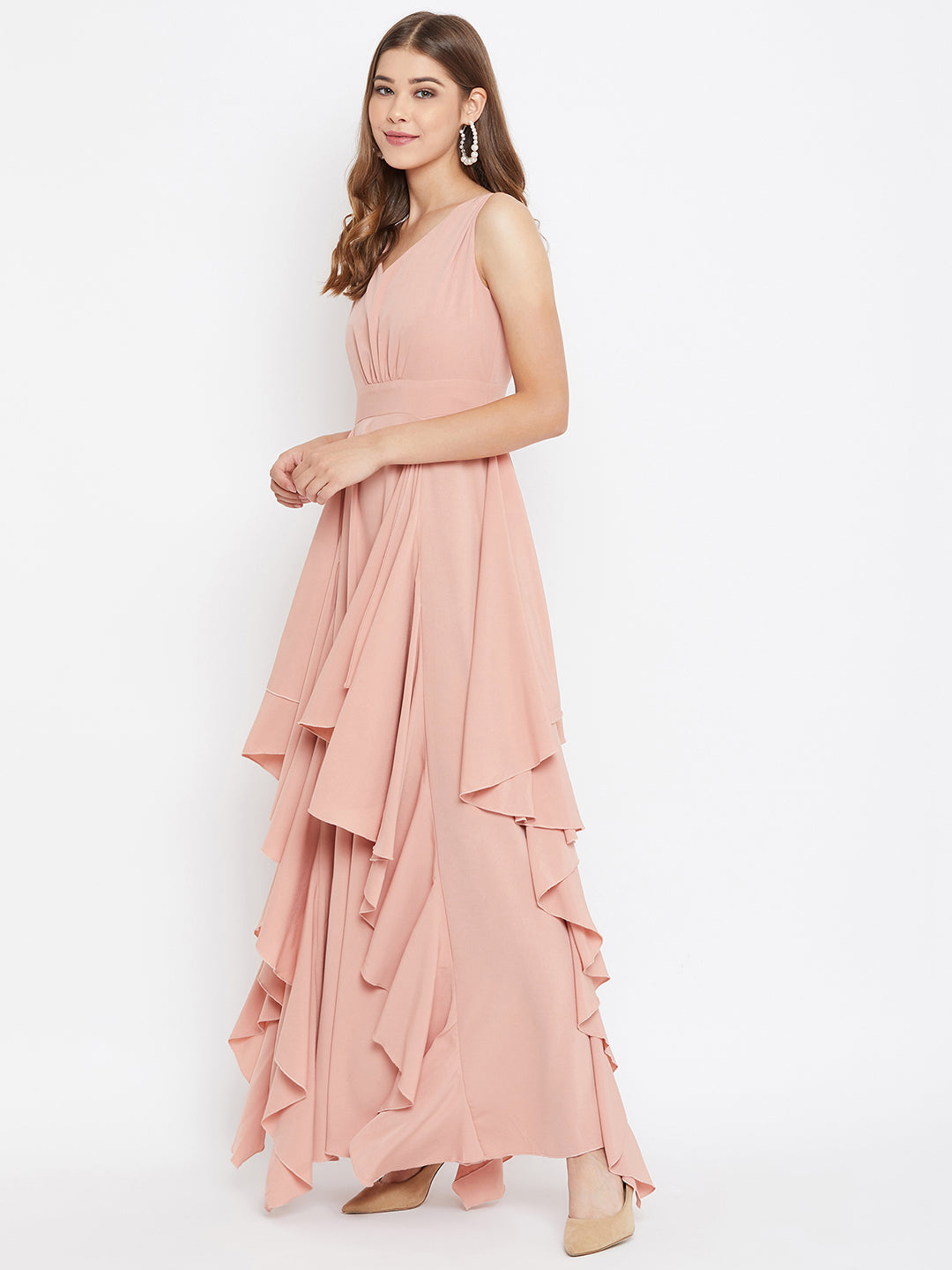 Berrylush Women Solid Pink V-Neck Layered Maxi Dress