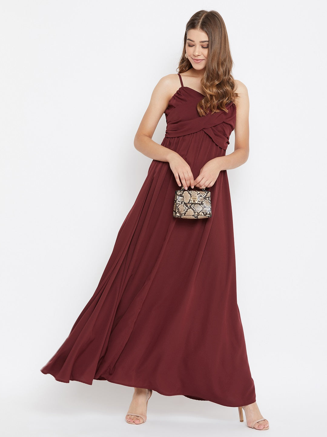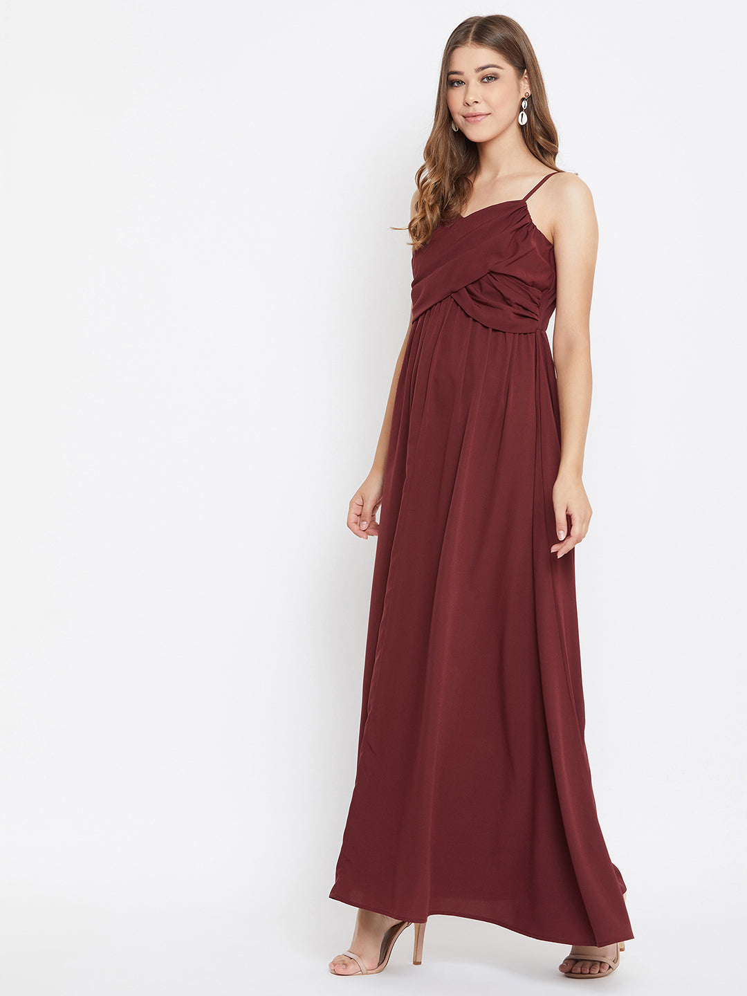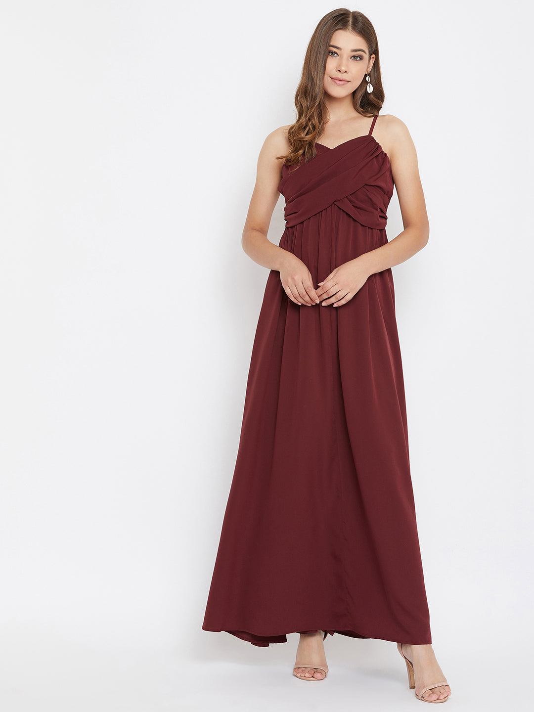 Give your party look a touch of charm by putting on this Solid Maroon V-Neck Sleeveless Ruched Bust Maxi Dress from Berrylush. The exclusiveness of this maroon maxi dress gains additional style with the fancy ruched bust that creates a flower-like appeal over the bust area. With the strappy shoulders, you will gain an impetus of a confident walk as you step towards your destination. The V-shaped neckline superbly holds a special element to your neckline that exclusively steals people's attention as you walk. Your aura at the party will get an extraordinary rhythm with the free floaty hemline of this Berrylush dress along with the pairing of heeled pumps.