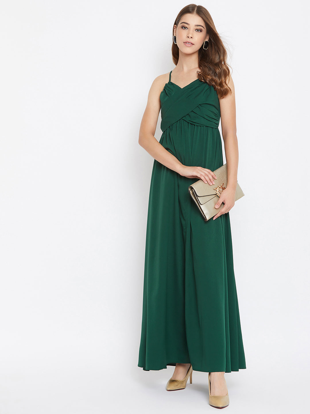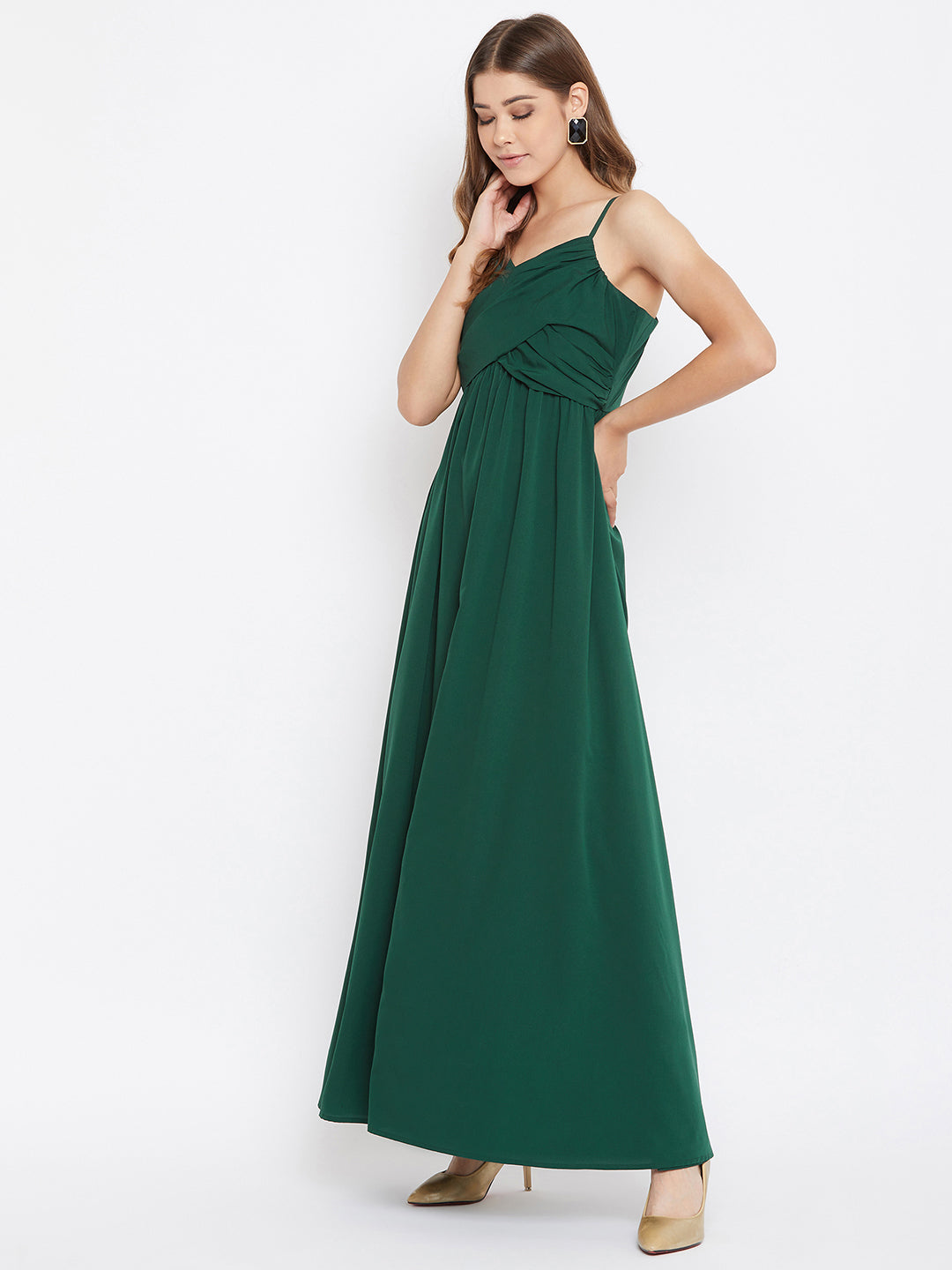 Berrylush Women Solid Green V-Neck Sleeveless Ruched Maxi Dress