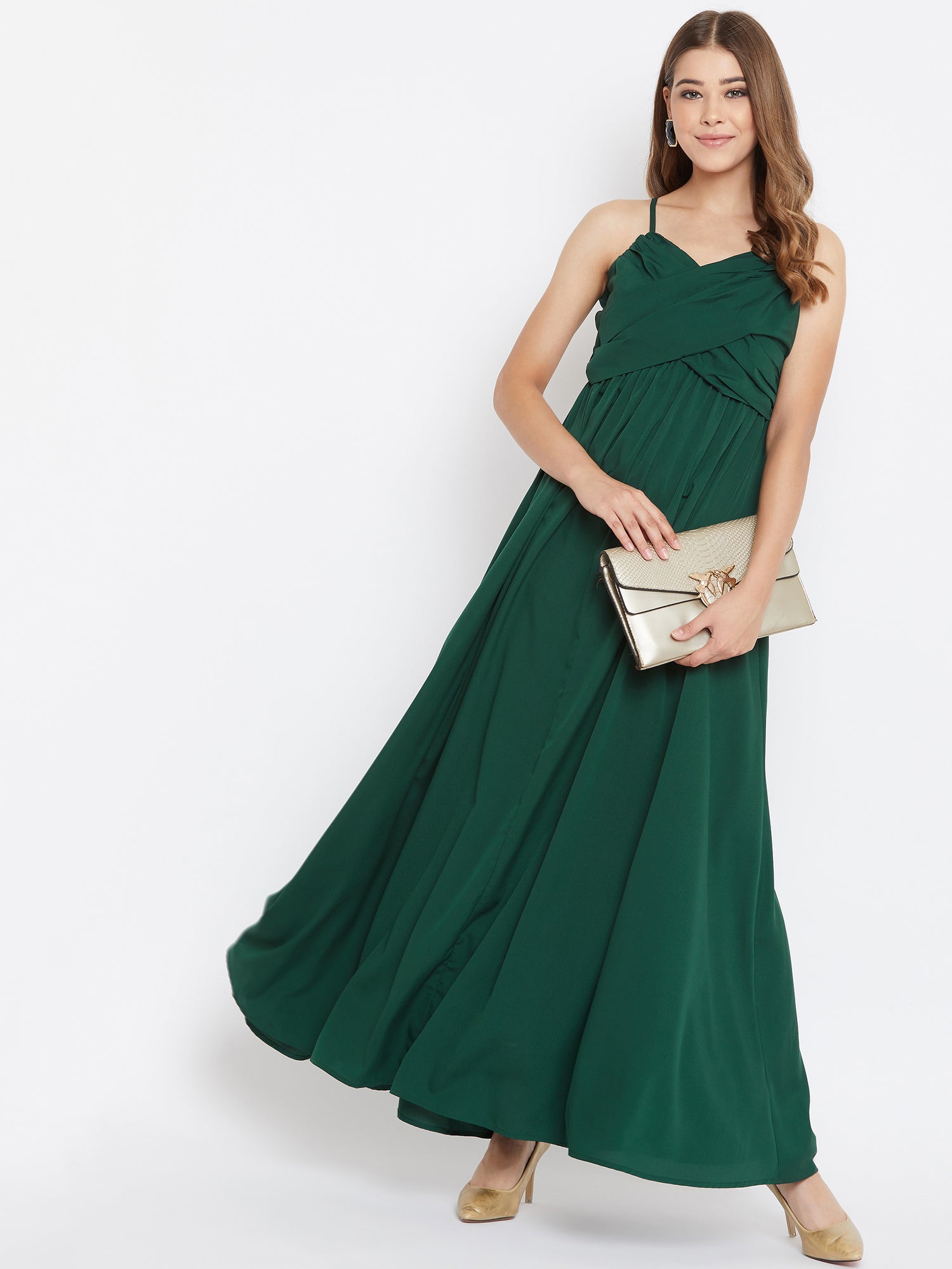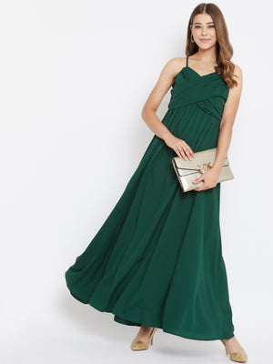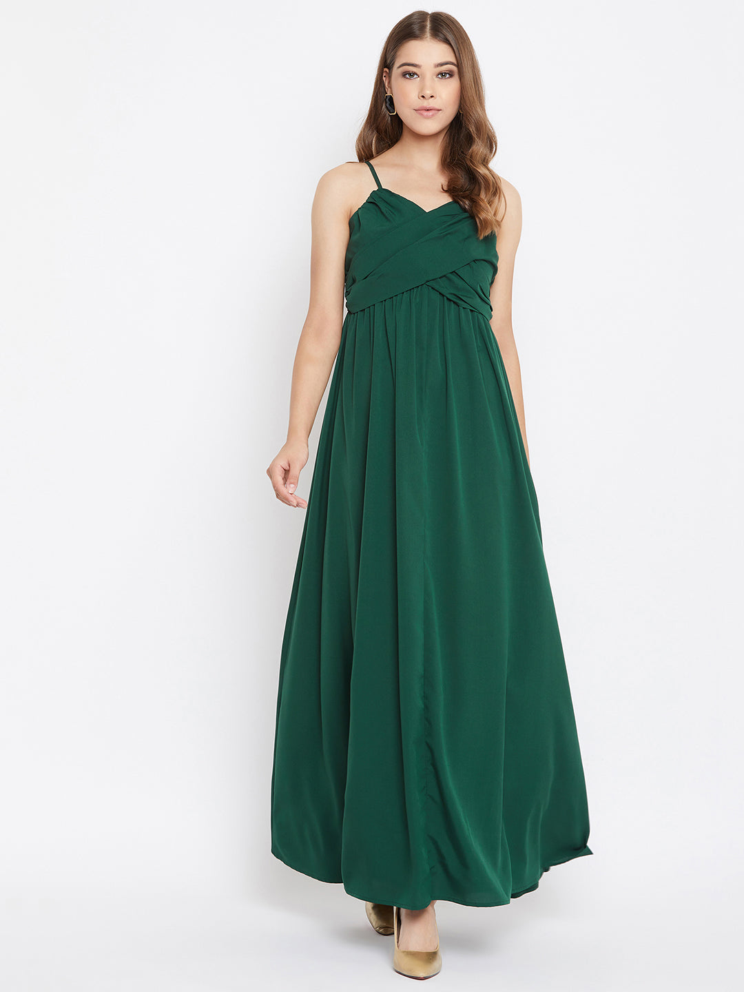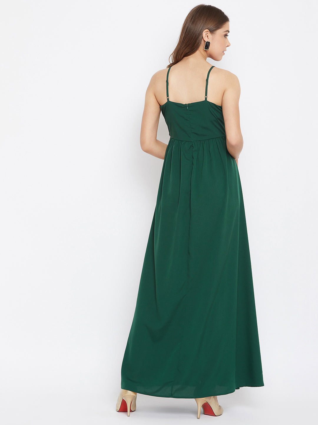 Stay green forever and spread the most energetic vibe with this Solid Green V-Neck Sleeveless Ruched Maxi Dress from Berrylush. For that tryst dinner date, this solid green colour will spontaneously sustain the freshness within you. Live in the soft petal-like fabric of the polyester and enjoy all-day long-wearing comfort with this dress. The most demanded strappy shoulders widen the shoulder line accordingly and make you look more in shape. Another attractive element that adds more stars to this fancy green maxi dress is the Ruched bust design which seems like a lush green leaf in itself. Match this iconic dress with an embellished clutch and heeled stilettos. Buy this fantastic green dress from Berrylush and stay youthful forever.
