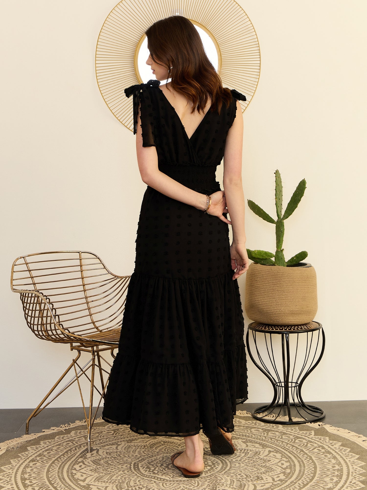 Berrylush Women Solid Black Dobby Weave V-Neck Sleeveless Tie-Up Straps Smocked Maxi Dress