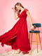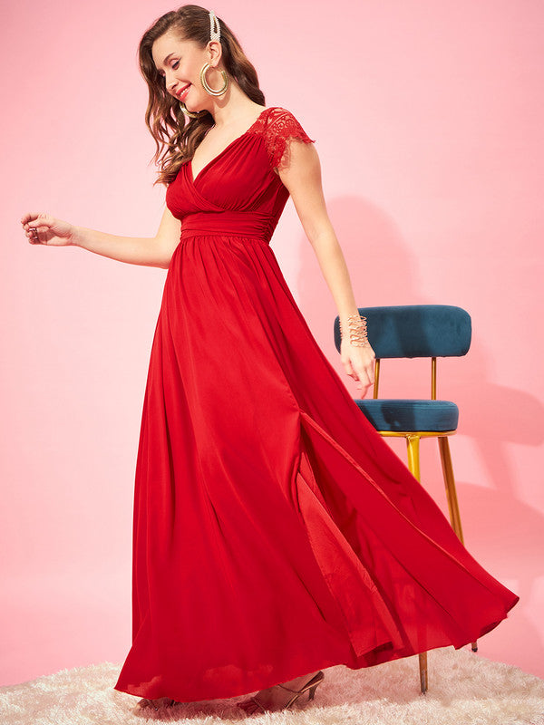 Berrylush Women Solid Red V-Neck Lace Inserts Thigh-High Slit Flared Maxi Dress