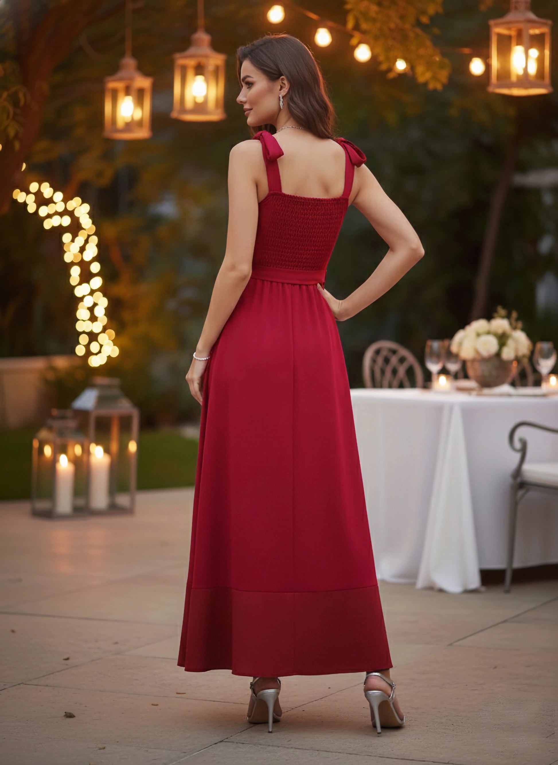 Step into the spotlight with Berrylush's Solid Red Square Neck Waist Tie-Up Cutout Georgette Thigh-High Slit Flared A-Line Maxi Dress. This stunning piece, crafted from luxurious woven polyester and equipped with a sleek georgette fabric, is designed to set you apart at any party. The bold red hue captures attention, while the elegant square neckline and sleeveless design add a touch of sophistication. Featuring an enticing thigh-high slit and flirty cutouts tied gracefully at the waist, this maxi dress flows beautifully into a flared hemline for effortless movement. Perfectly lined for comfort without sacrificing style — this dress promises a look that’s both captivating and classy.