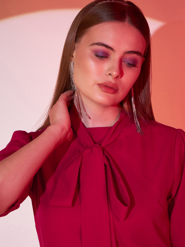 Step out in style with the Berrylush Solid Red Tie-Up Neck Puff Sleeves Dress. Perfect for any party, this mini dress flaunts short puff sleeves and a charming tie-up neckline that adds a touch of sophisticated flirtation. A fit-and-flare skirt complements its solid red colour, offering a silhouette that twirls beautifully at every turn. Crafted from woven polyester with semi-sheer detailing and fully lined for comfort, this dress makes you the centre of attention while ensuring ease all evening long. Embrace elegance without sacrificing fun in your new favourite ensemble!