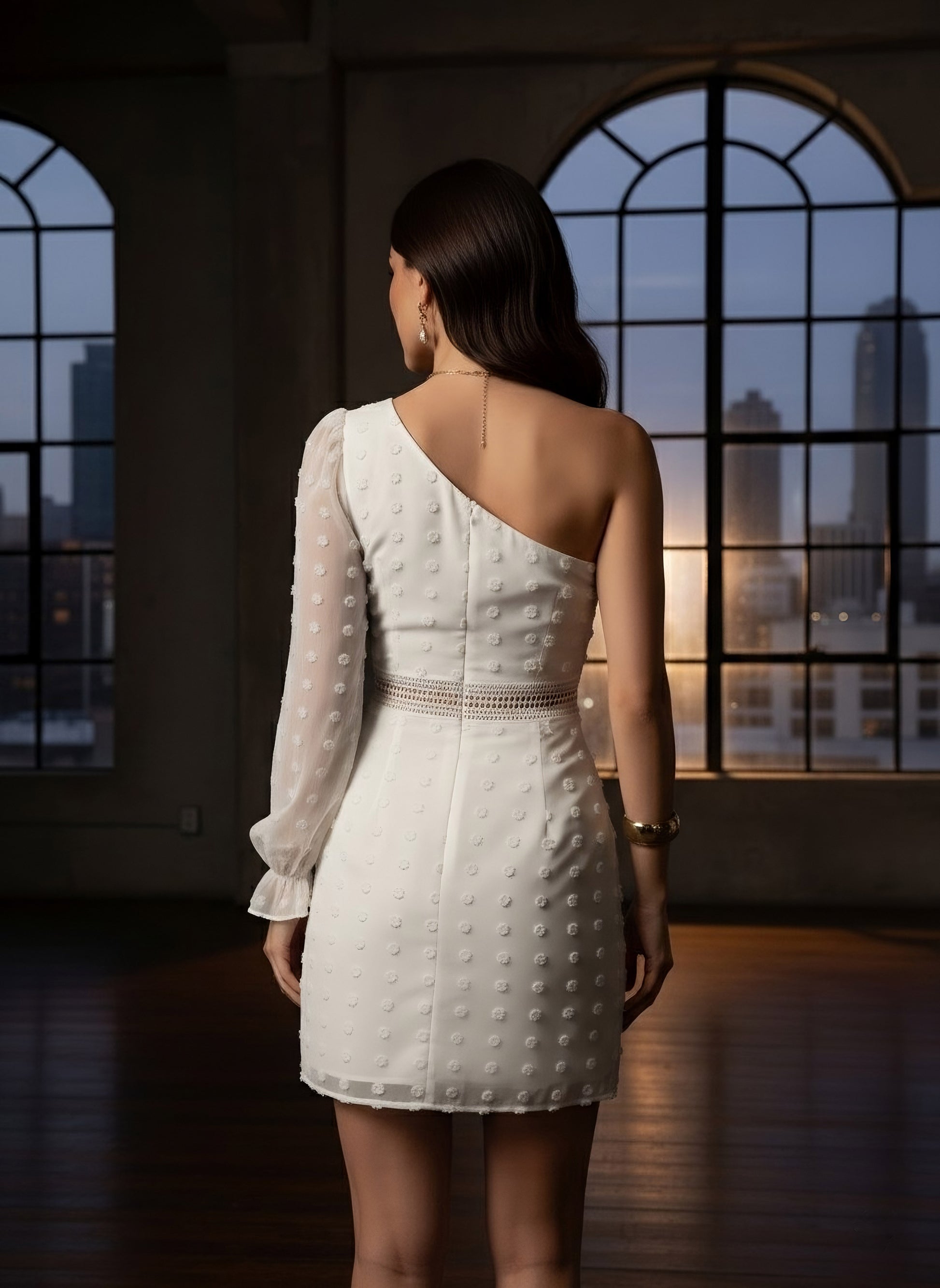 Berrylush Women White Solid One-Shoulder Neck Bishop Sleeves Bodycon Mini Dress