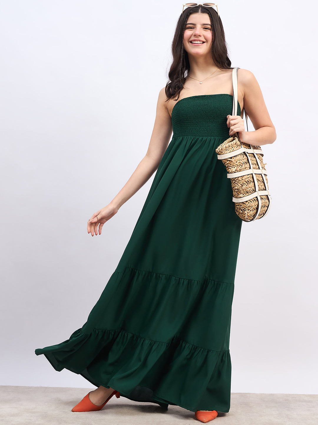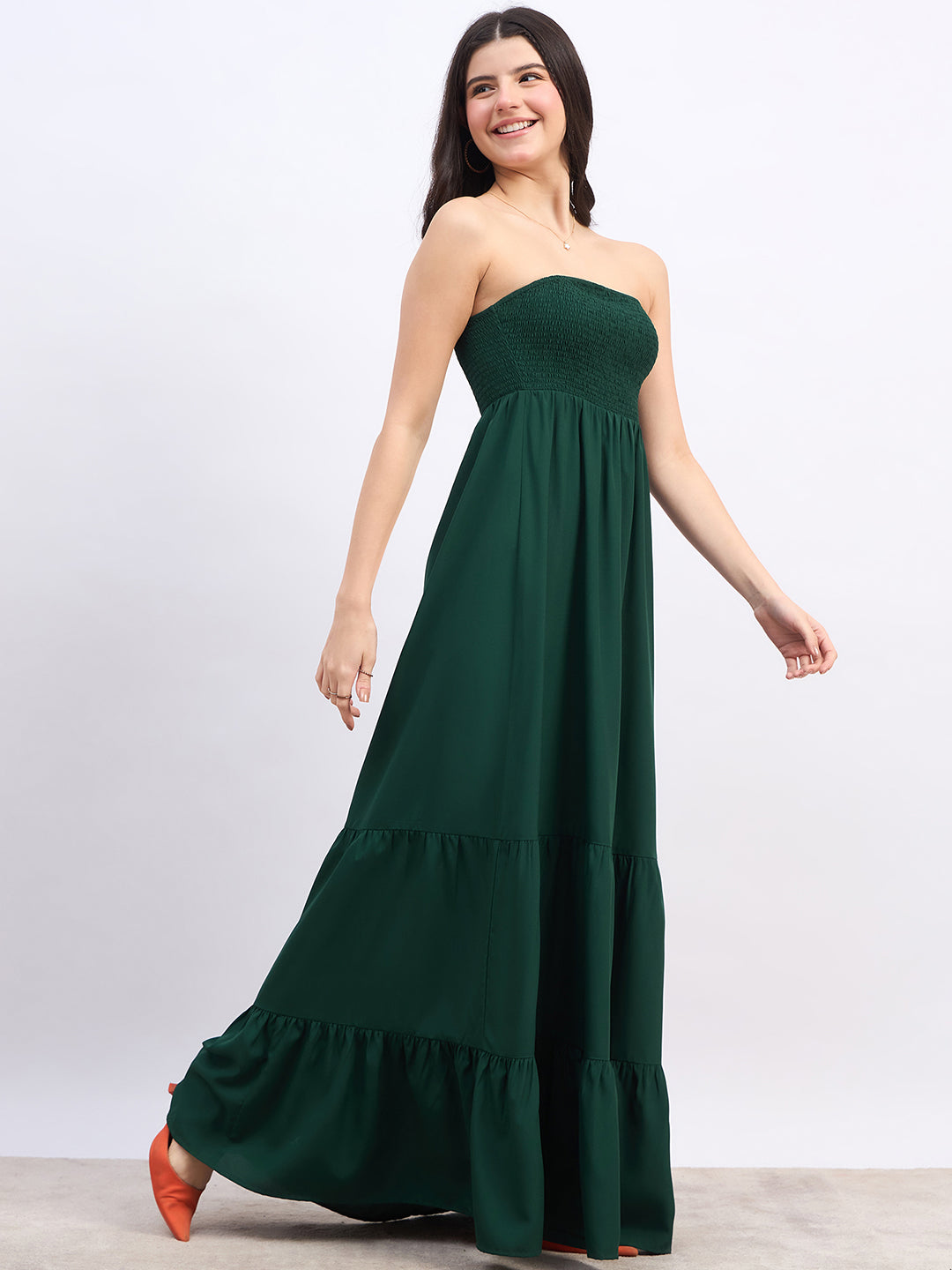 Berrylush Women Solid Green Strapless Neck Sleeveless Smocked A-Line Maxi Dress