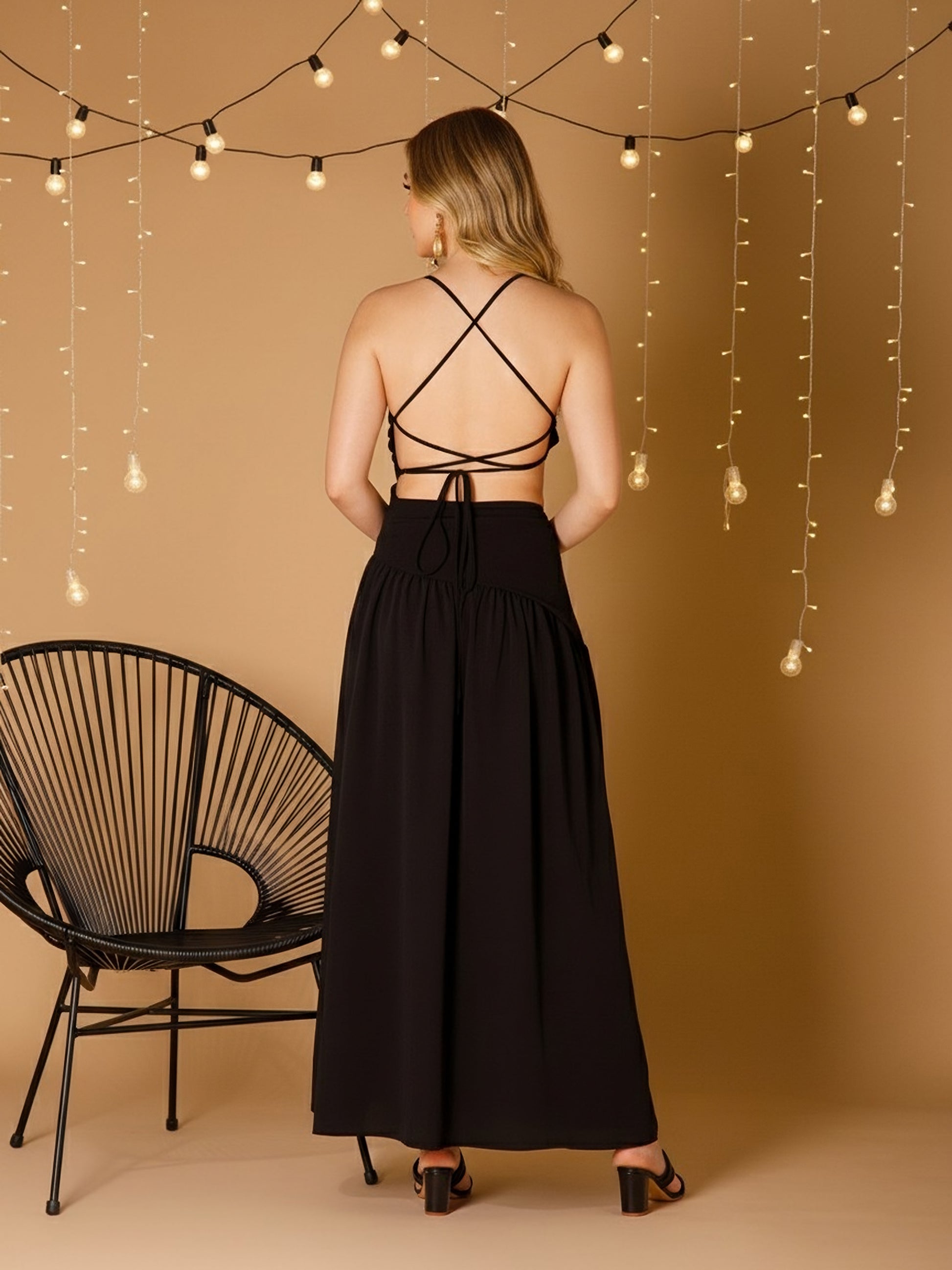 Berrylush Women Black Solid Shoulder Straps Flared Sexy Maxi Dress