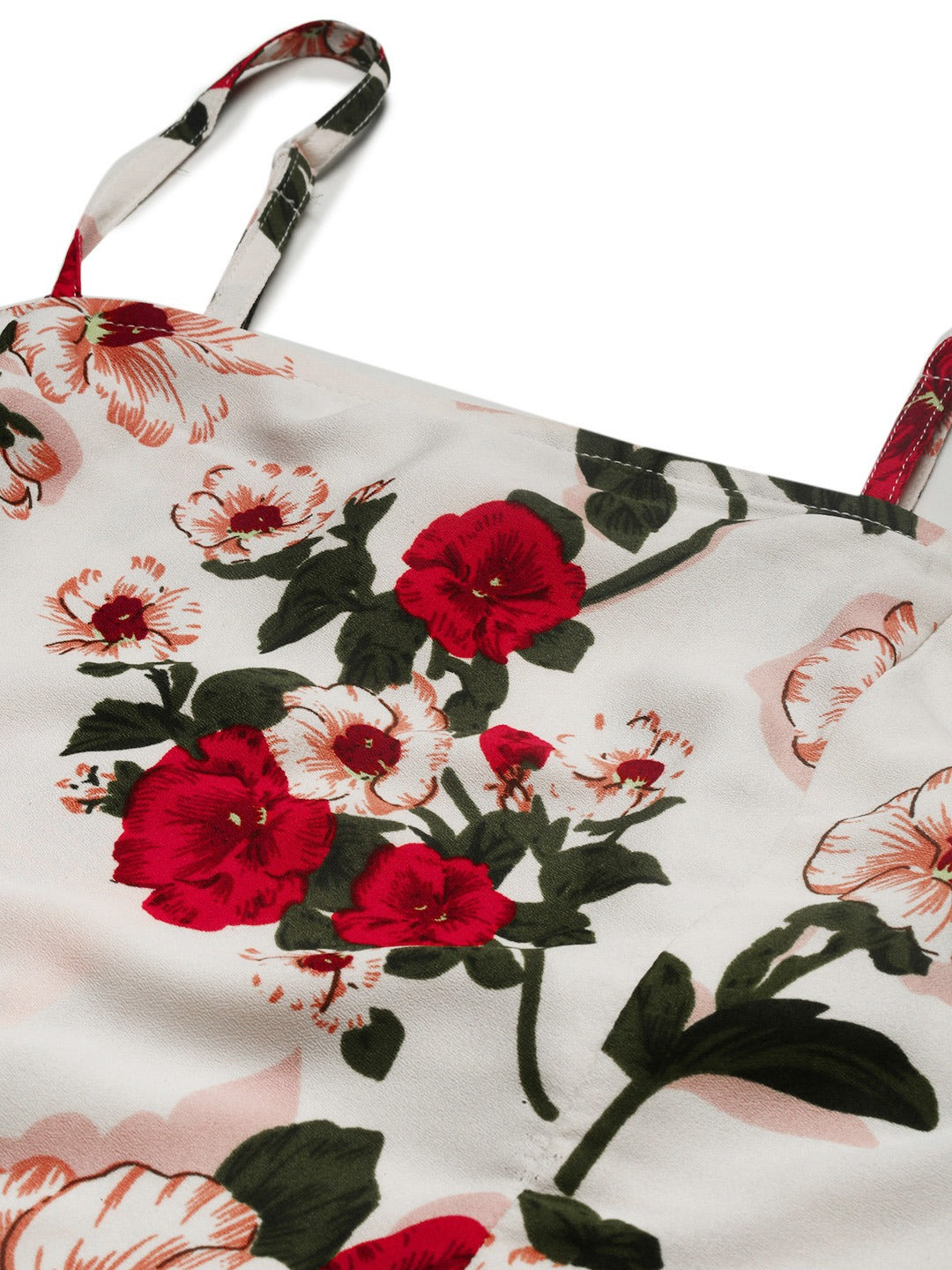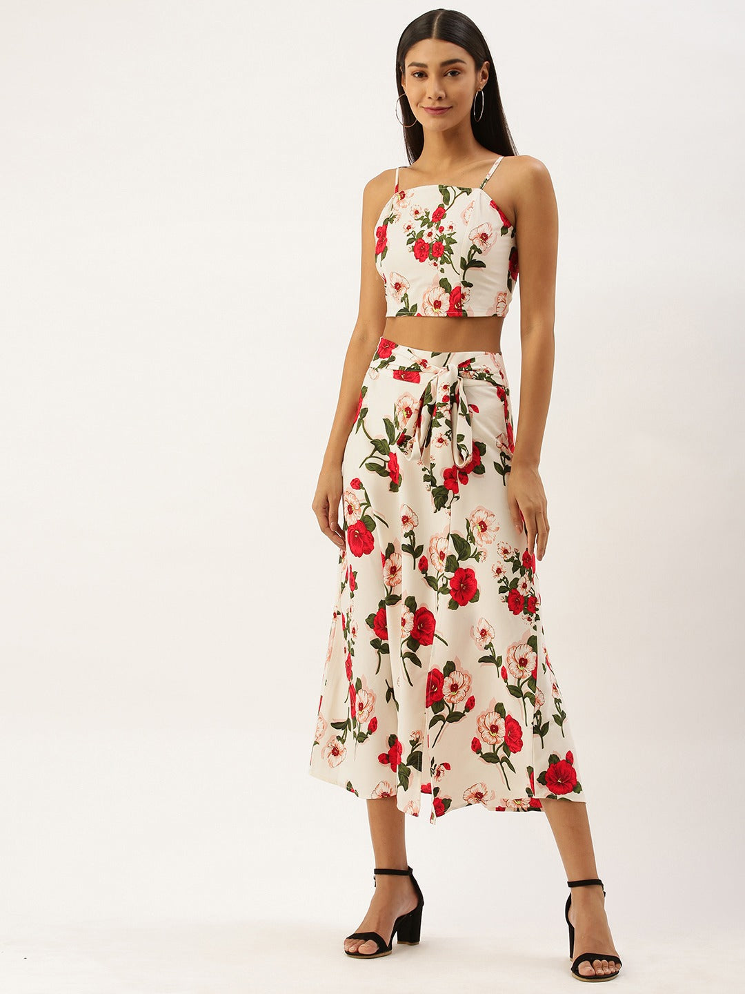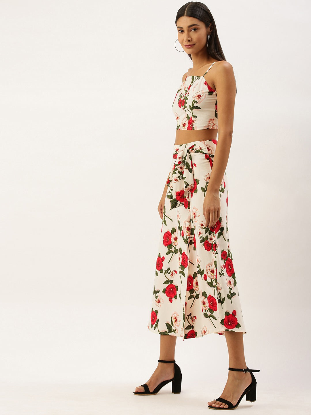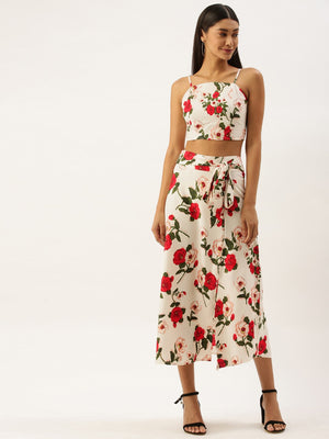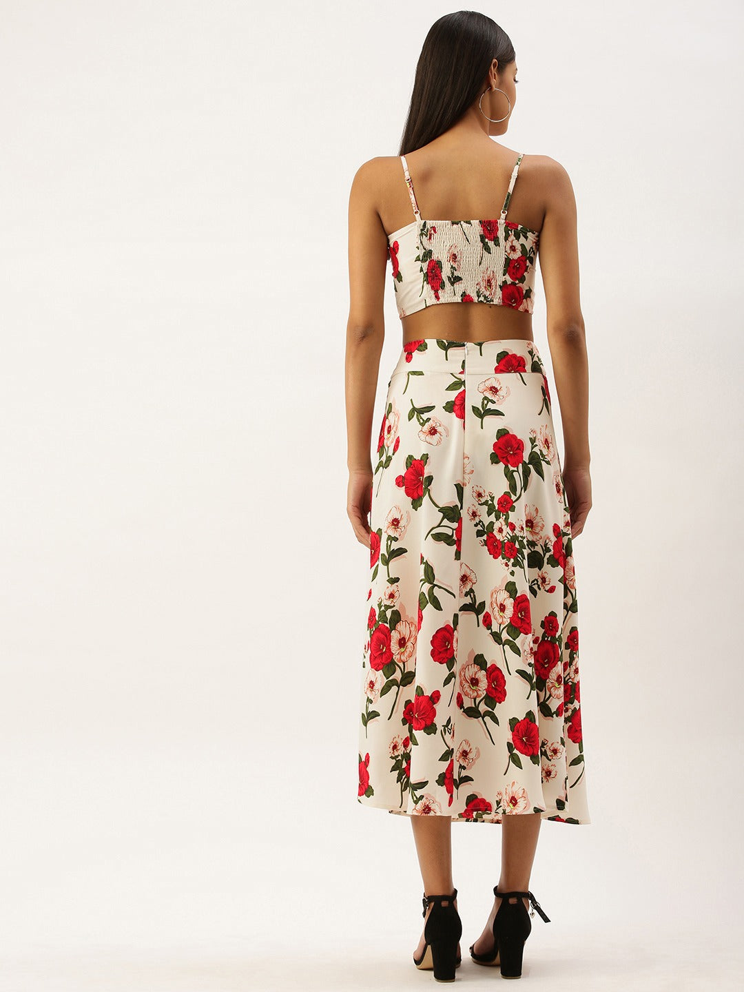 Chic White Floral Print Co-Ordinate Midi Dress from Berrylush, for a woman who loves to explore new horizons. Mold your monotonous way of styling into pristine charming floral apparel that comes with a magnificent design. A cheeky white strappy shoulder crop top that provides enough space for your shoulder, neckline, and arms and flatters them perfectly. Dress like a supermodel and show the magic of your charming aura. A perfect beachwear staple with an A-line bottom skirt that has a stylish front little slit. Become a stunner by matching this outfit with gladiator heels and minimal makeup. Try this cute two-piece from Berrylush and add colorful pages to your beach days photo album.