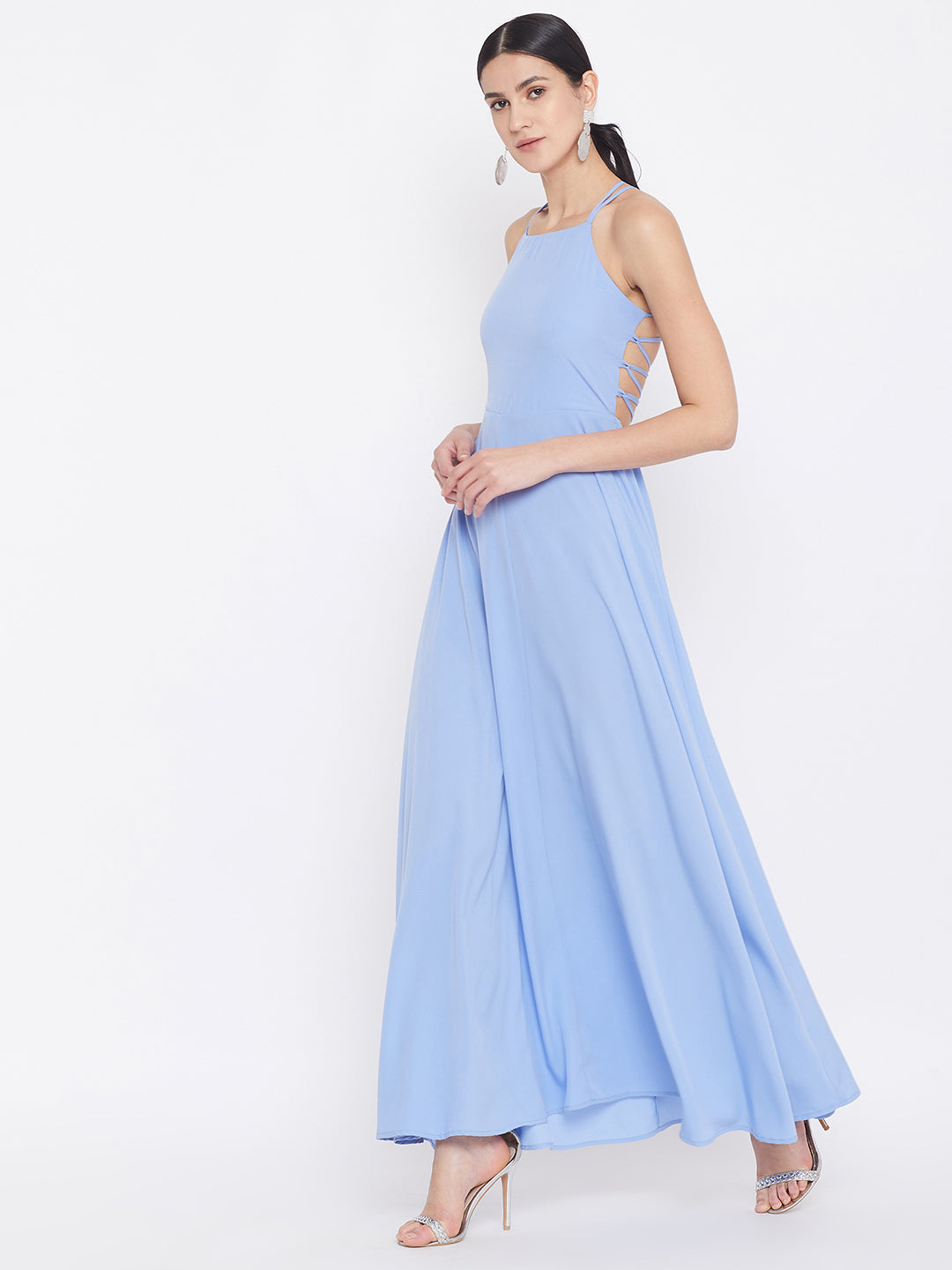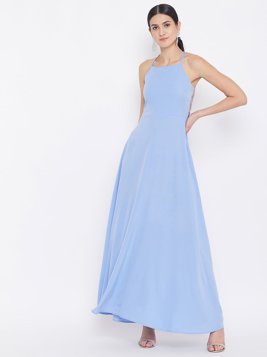Keep your party wardrobe versatile and exotic with this tantalizing Solid Blue Square Neck Tie-Up Caged Back Flared Maxi Dress from Berrylush. The most enticing feature of this maxi dress is its tie-back detailing which gives an alluring appeal to your beautiful back. Comes with shoulder straps for an additional feminine touch and a sleeveless feature provides redistricted free movement to your arms. Designed with pleated surface styling to lend flattering texture to this maxi dress. Complete your bewitching look by pairing this classy maxi dress with pump heels, minimalistic silver jewellery, and a trendy clutch.