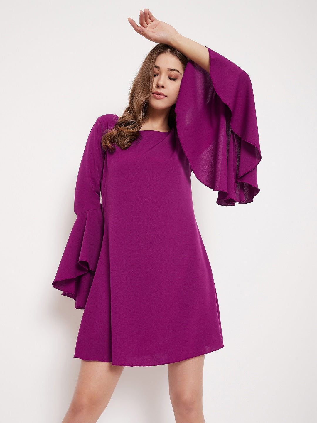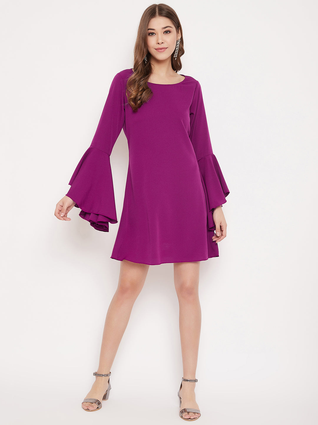 Berrylush Women Solid Purple Bell Sleeves A-Line Mini Dress