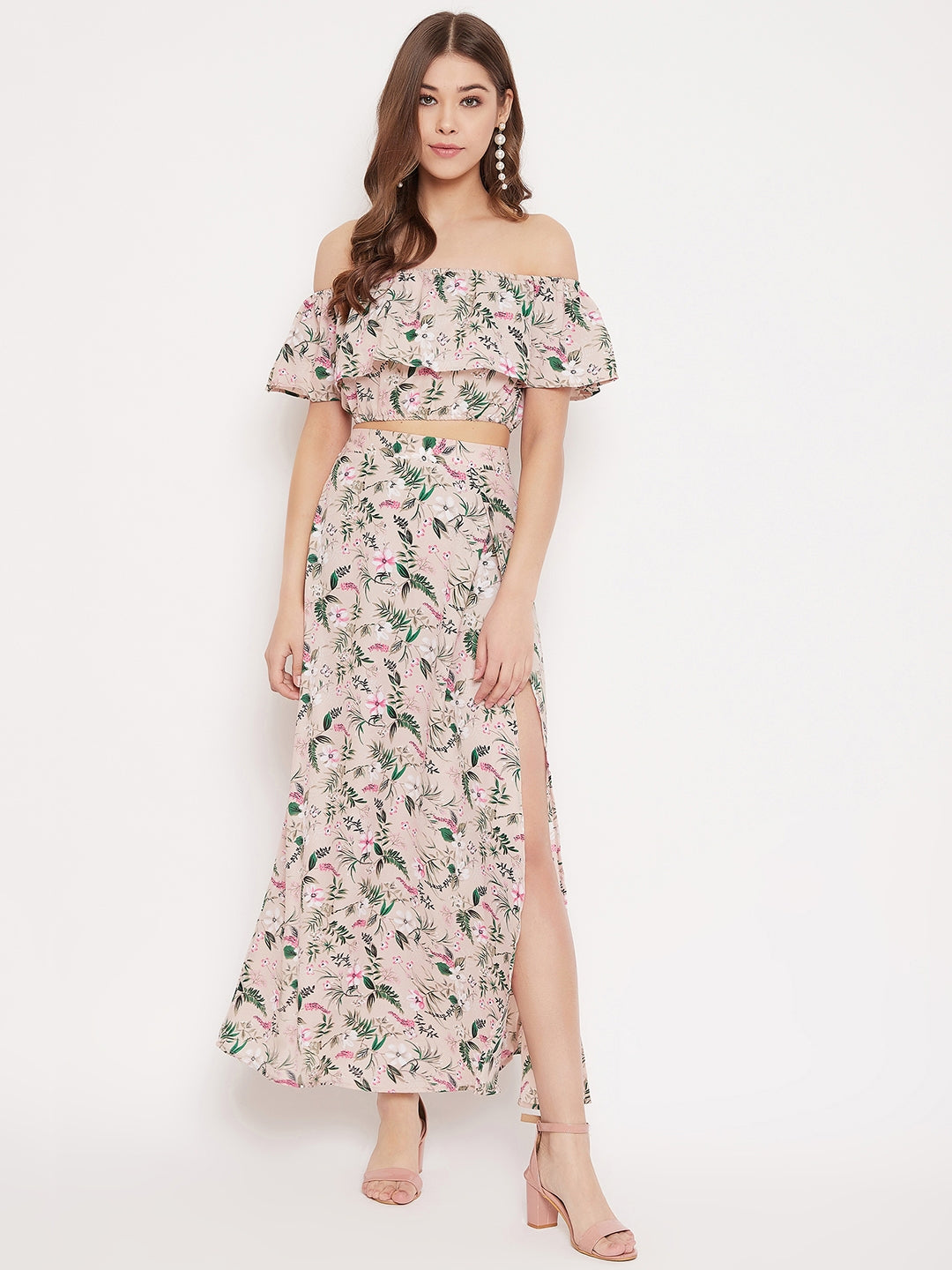 Beige printed woven co-ordinate sets dress, has an off-shoulder neck, short sleeves, concealed zip closure, and flared hem