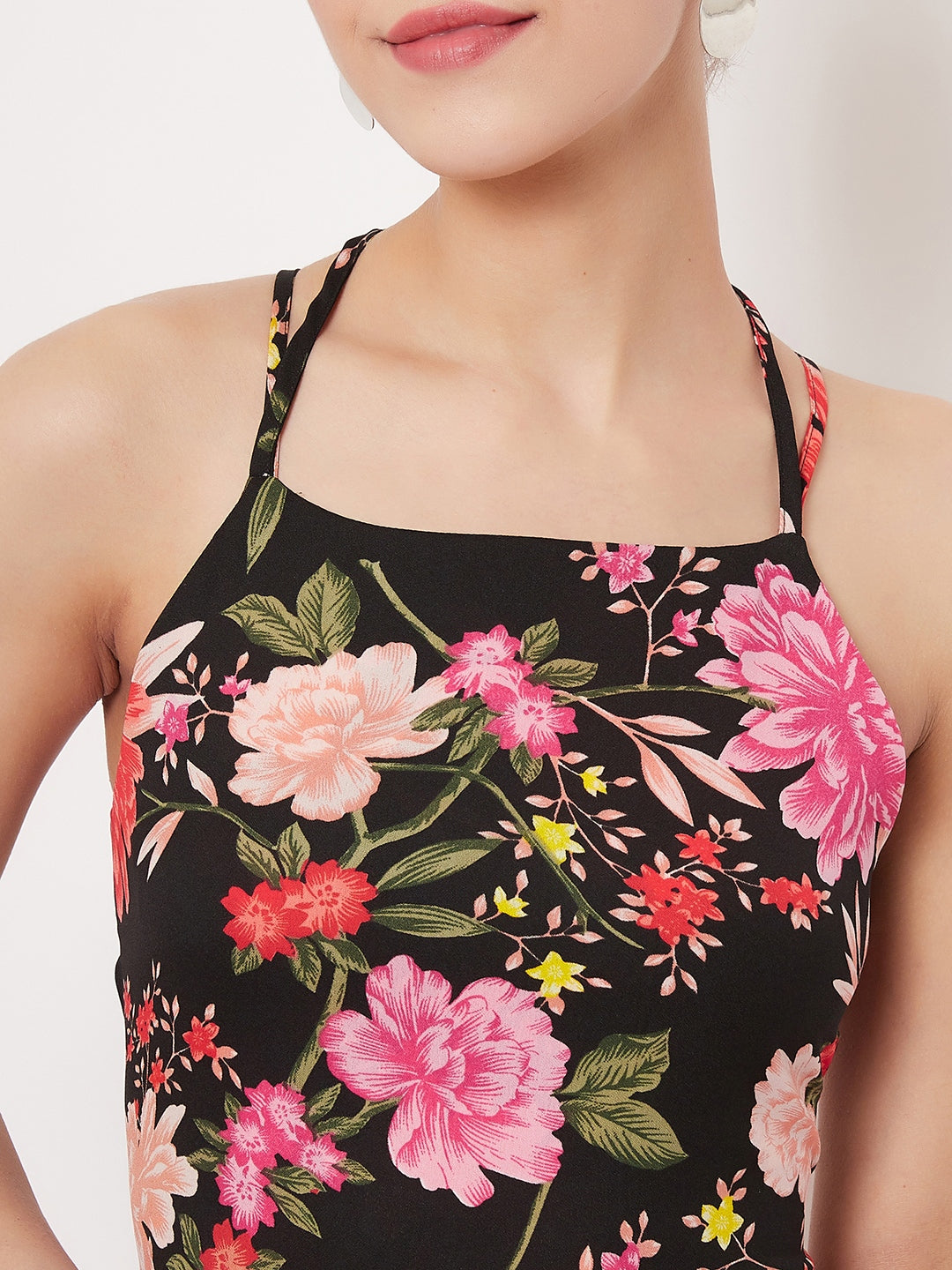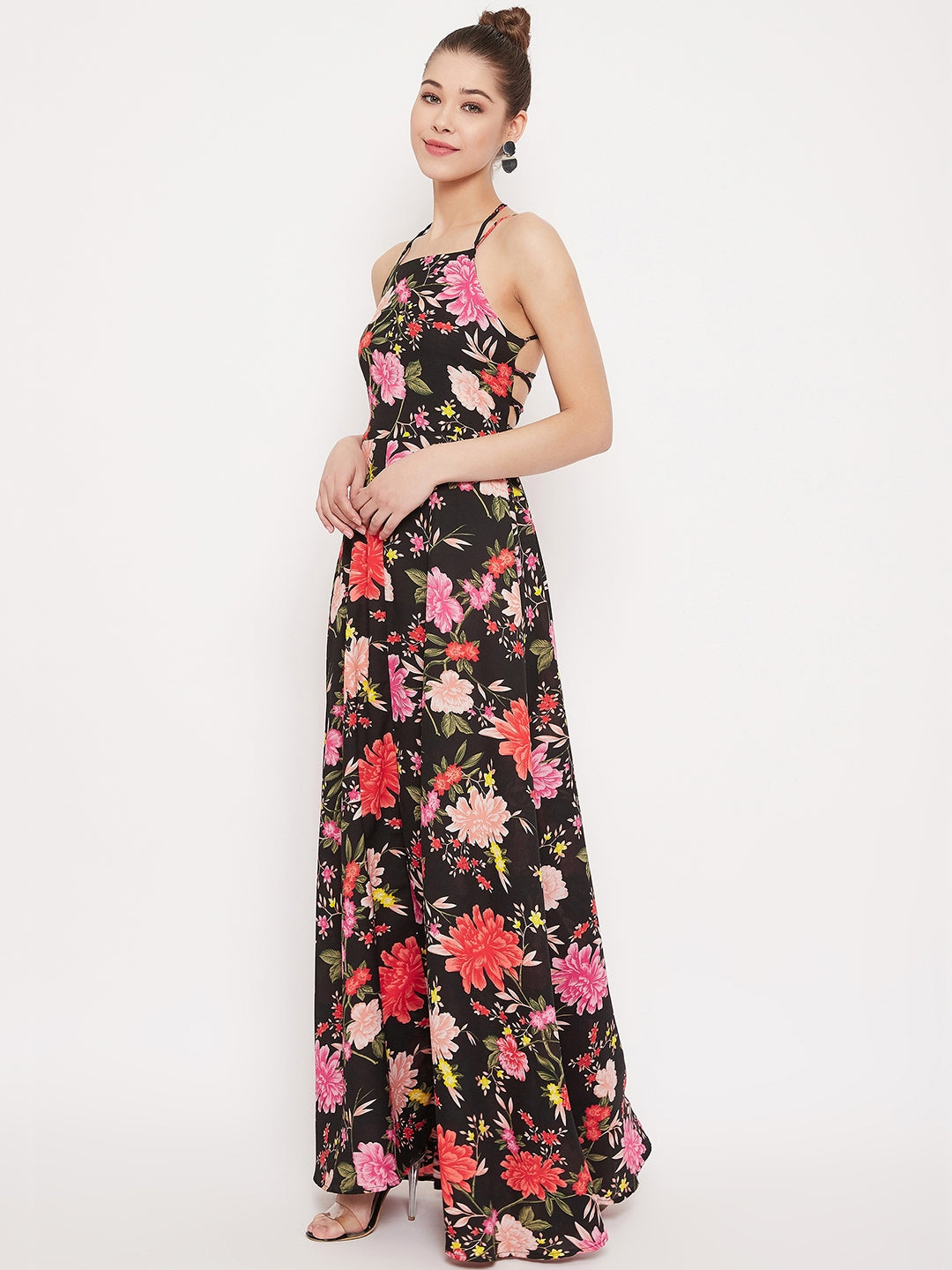 Berrylush Women Black Floral Printed Tie-Up Backless Maxi Dress