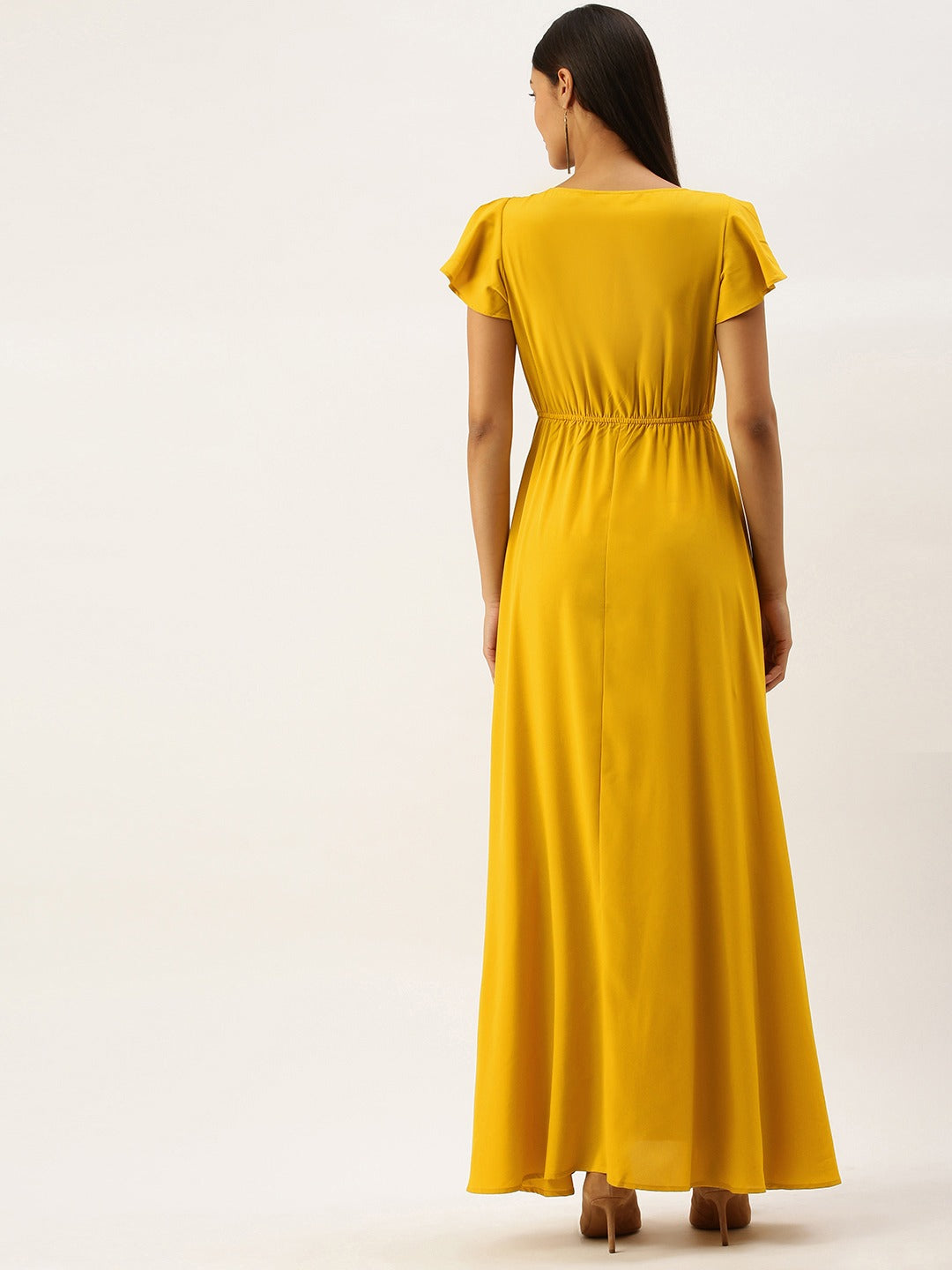 Never go out of style with this Berrylush Solid Yellow V-Neck Short Sleeve Maxi Dress. This elegant maxi dress is tailored with polyester fabric to keep you comfortable all day long. The short flared sleeves with flared hemline fall gracefully to give you a chic appearance. The hem also has slit detailing for a fashionable appeal. The V-neckline of this dress highlights your collar bones. Its cinched waist beautifully wraps around your body for a figure-flattering look. This stylish yet elegant maxi dress is perfect for casual gatherings or special evenings. Complete your look by complementing it with your favorite handbag or clutch and cute high heels.