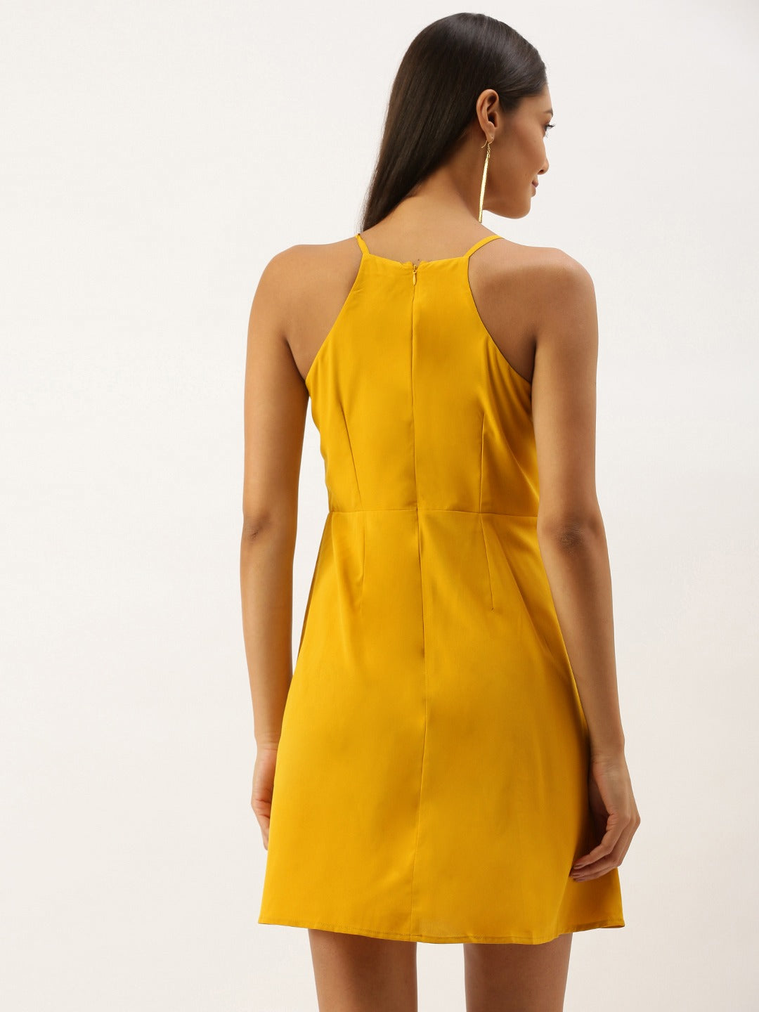 Berrylush Women Mustard Yellow Halter Neck Mini Dress