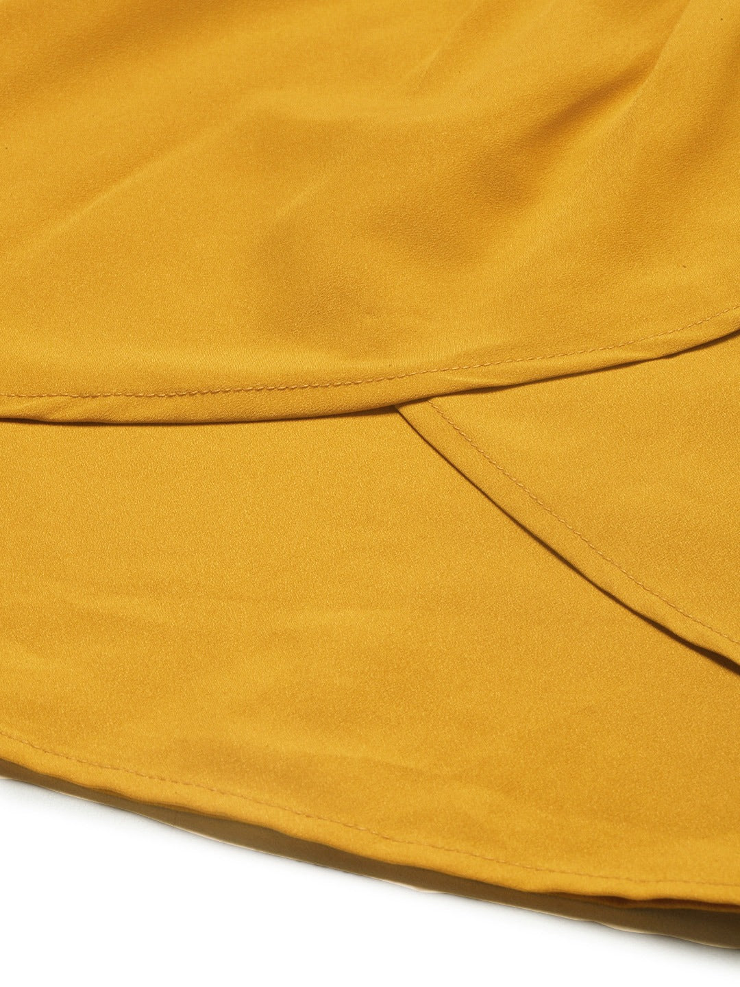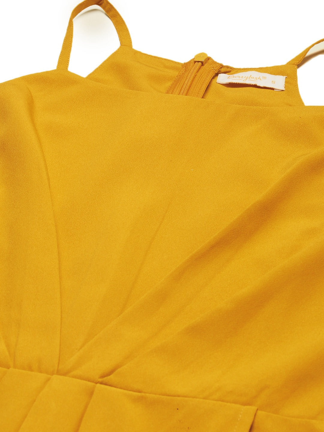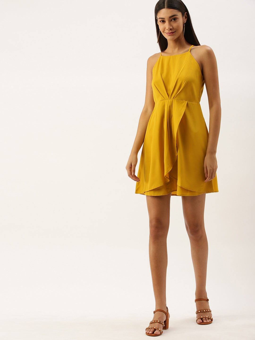 Grab everyone's attention in this trendy Berrylush Mustard Yellow Halter Neck Mini Dress. Pleats and ruffles never go out of fashion and this lovely dress is designed with delicate pleated ruffles at the front to make it a modish outfit for casual occasions. The halter neckline of this dress with a sleeveless design accentuates your shoulders for a captivating look while its A-line silhouette drops down to a flared hem to create a slender appeal. This solid-patterned dress is stitched with polyester crepe fabric for a comfortable feel. Put on your favorite heels or shoes with this chic mini dress and slay this summer season
