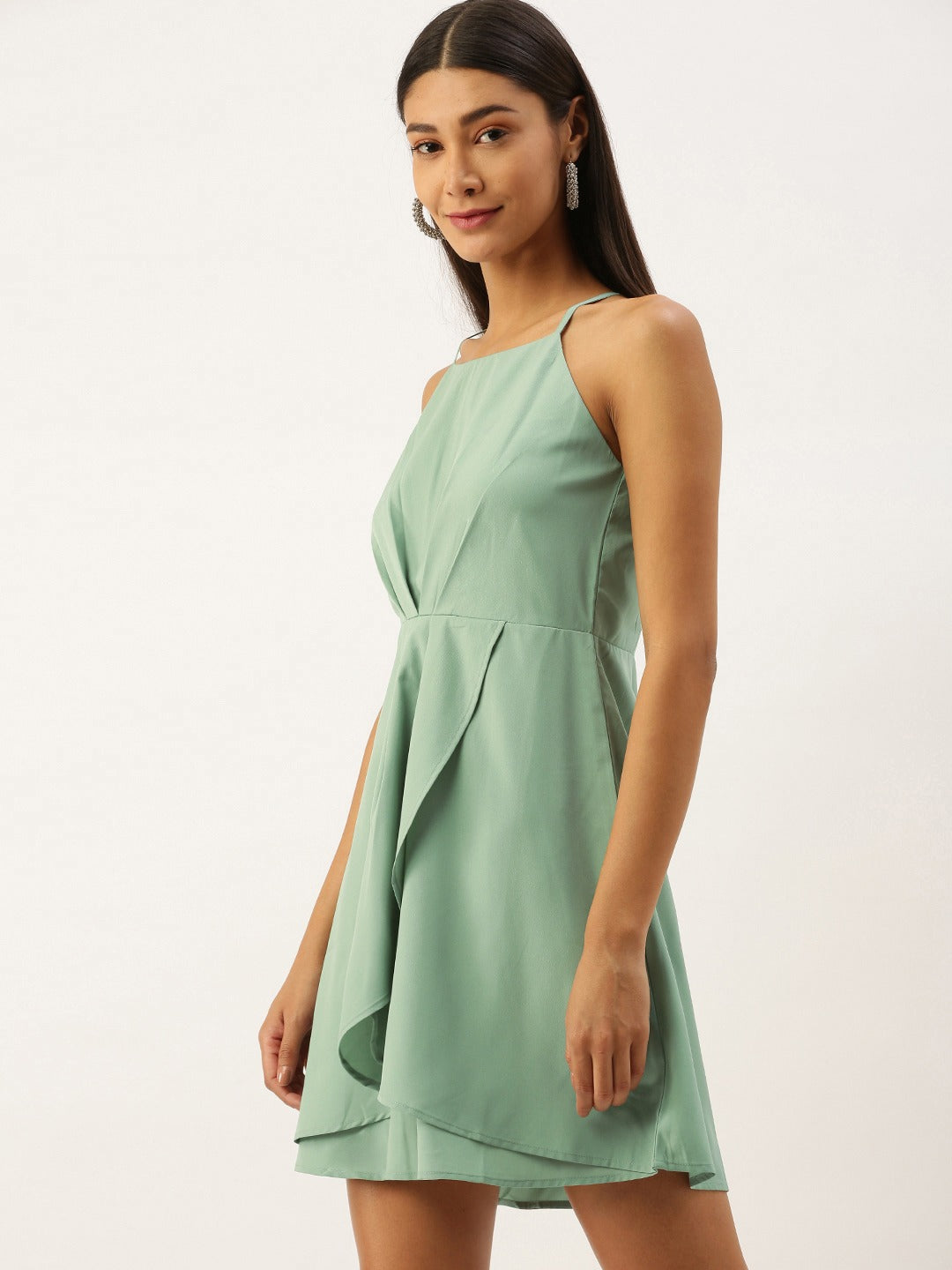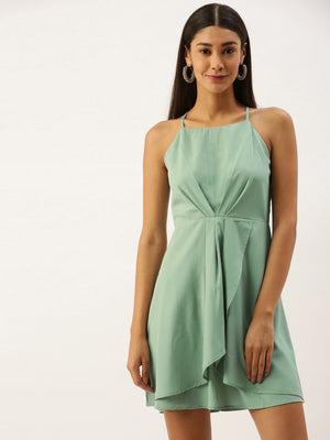 Looking for an evergreen collection then this cute Solid Teal Green Halter Neck Mini Dress by Berrylush is an ideal choice for you. This A-line dress will definitely leave an everlasting impact on your office event! The flared hem with a neat ruffle wrap on the skirt gives you an elegant look. The sleeveless monochrome is made of durable crepe fabric thus perfect for the last-minute rush. The woven silhouette is super comfy for all seasons. The halter neck dress has shoulder straps and a zip concealed back adding to your confidence. The unique teal color of the dress can help you dazzle at any kind of event. So what are you waiting for! Dress up in this mini with high cut-out heels and a cute blazer to cheer up the weather.