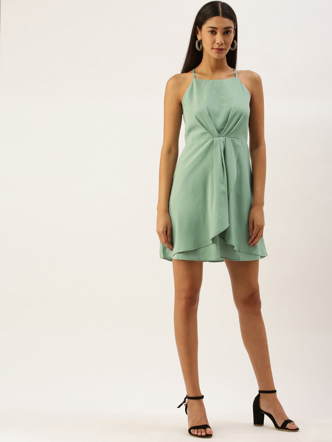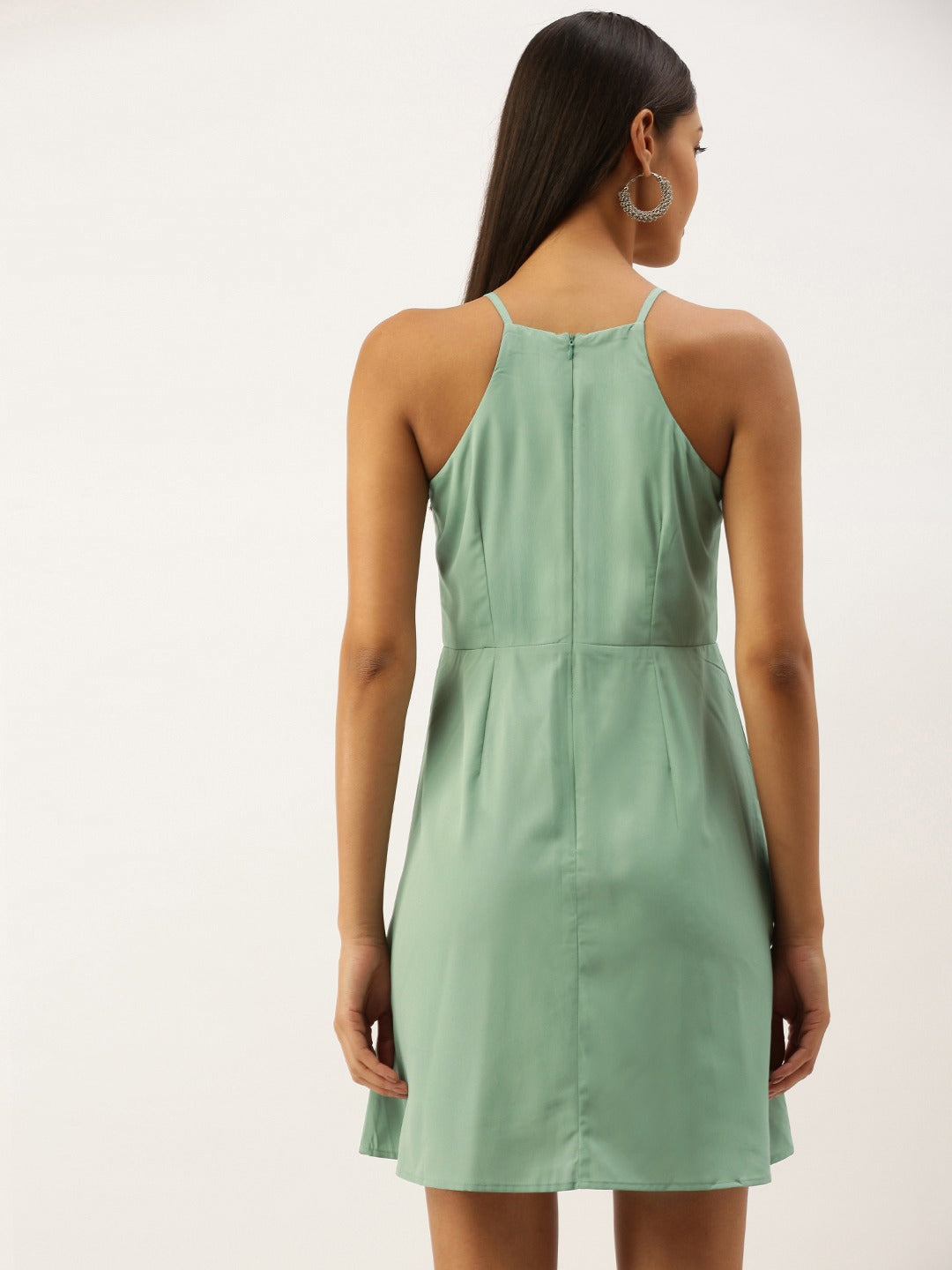 Berrylush Women Solid Teal Green Halter Neck Mini Dress