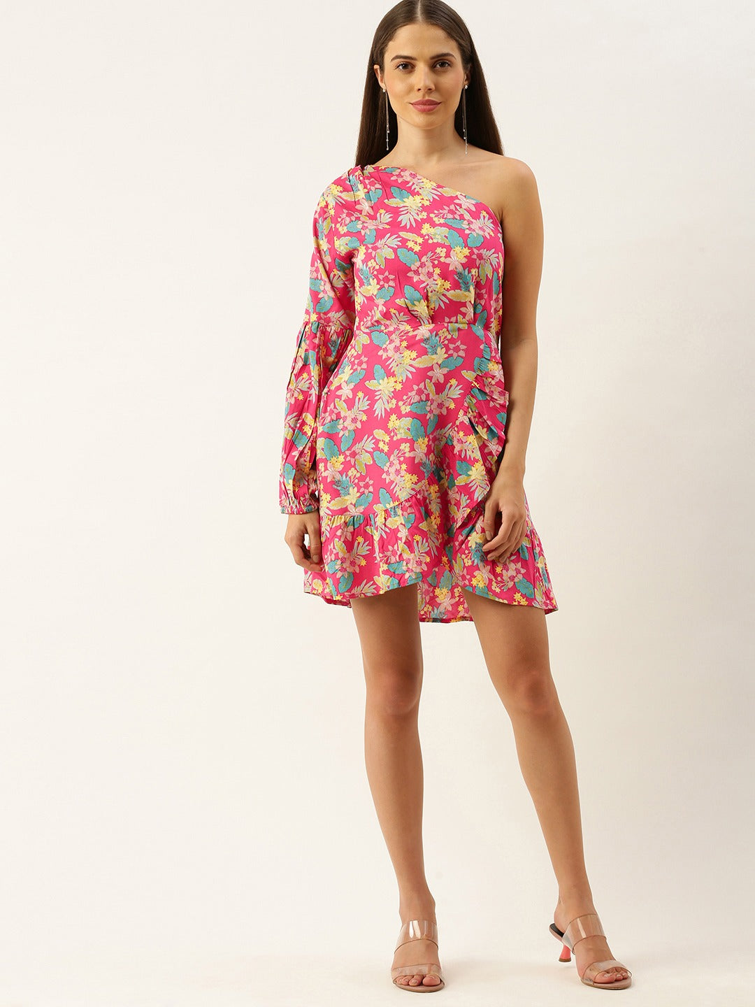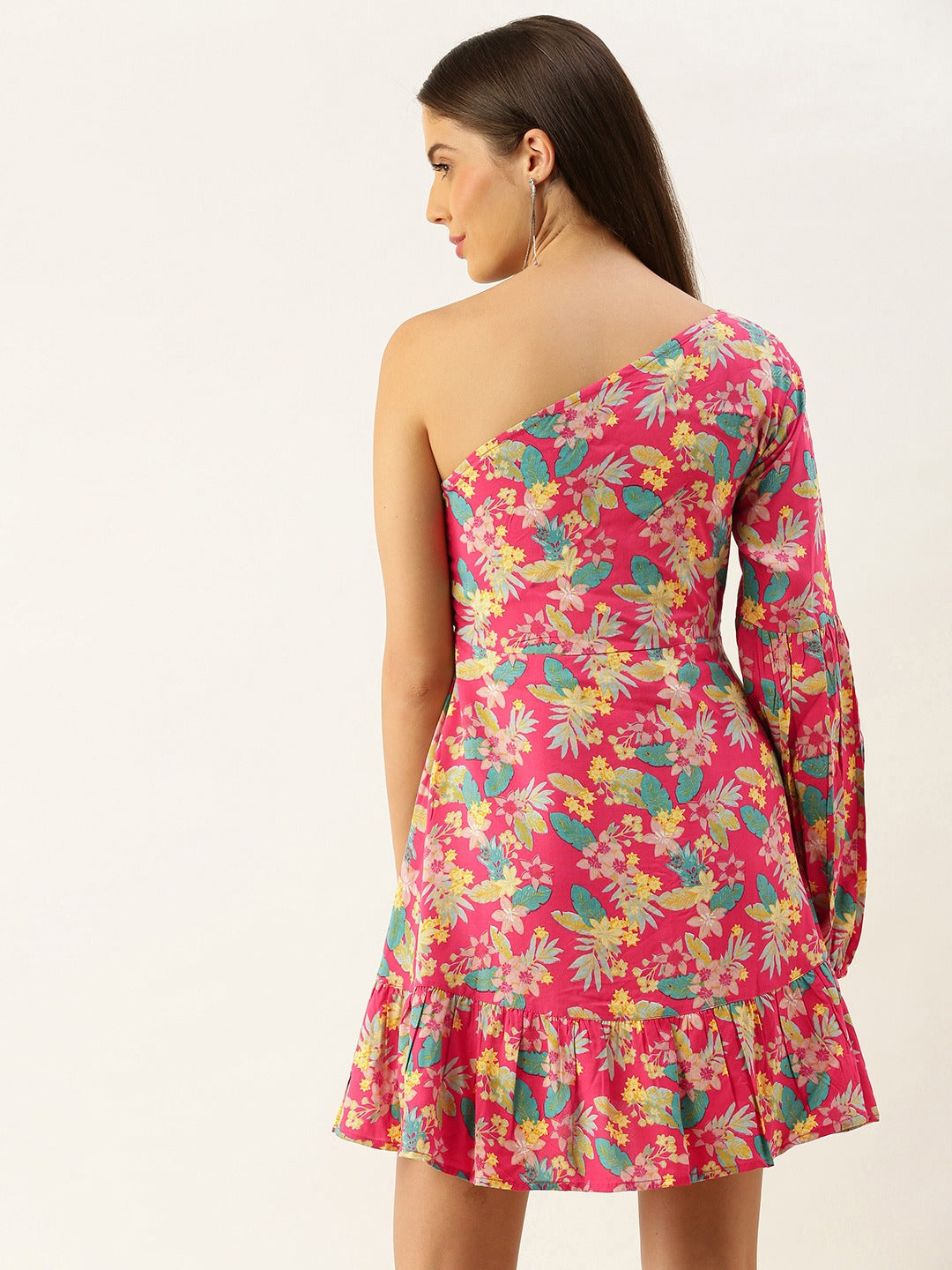 Berrylush Women Pink Floral One-Shoulder Fit & Flare Mini Dress