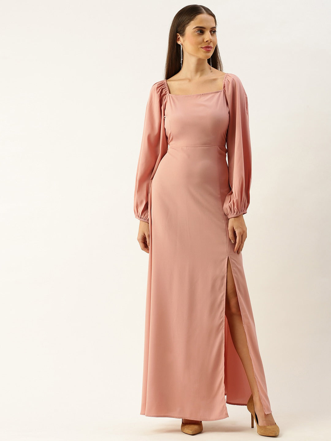 Berrylush Women Solid Peach Square Neck Slim-Fit Maxi Dress