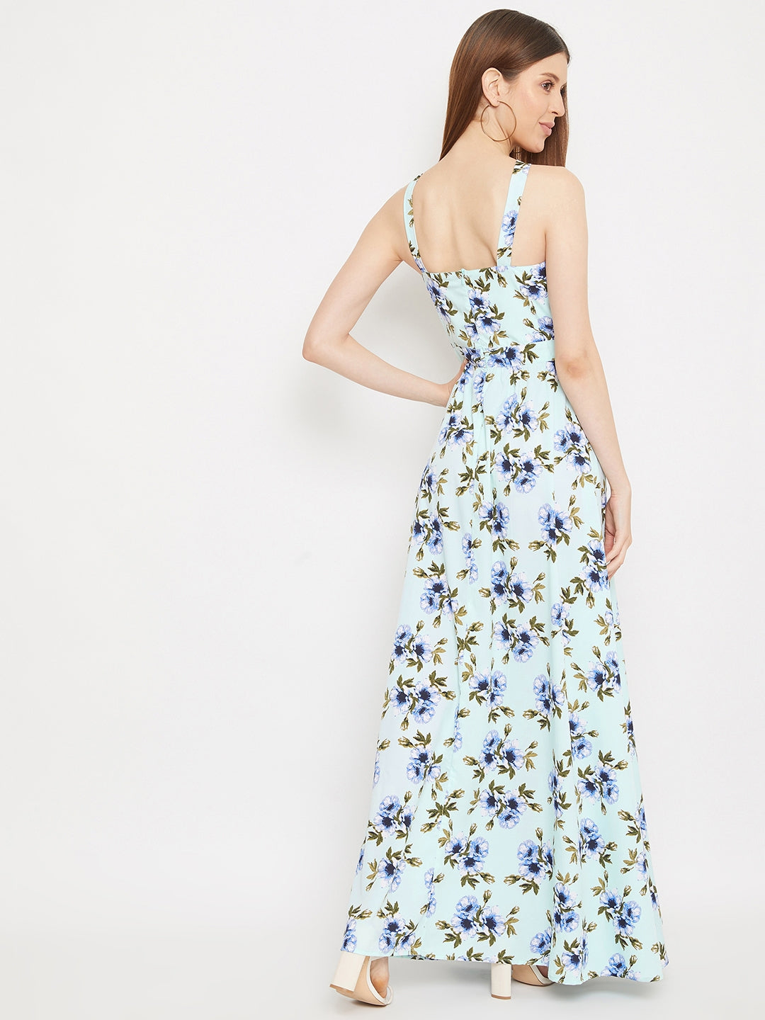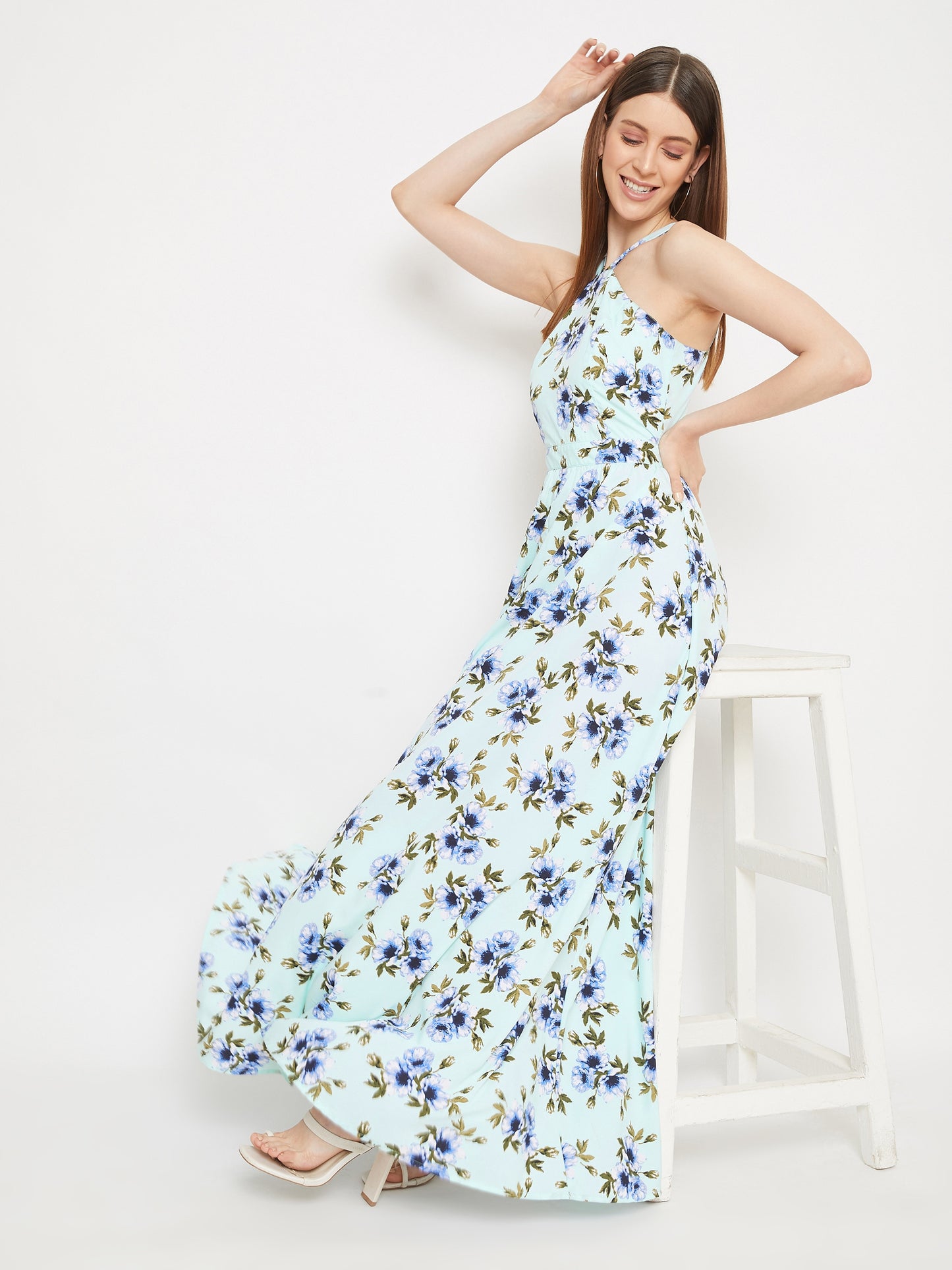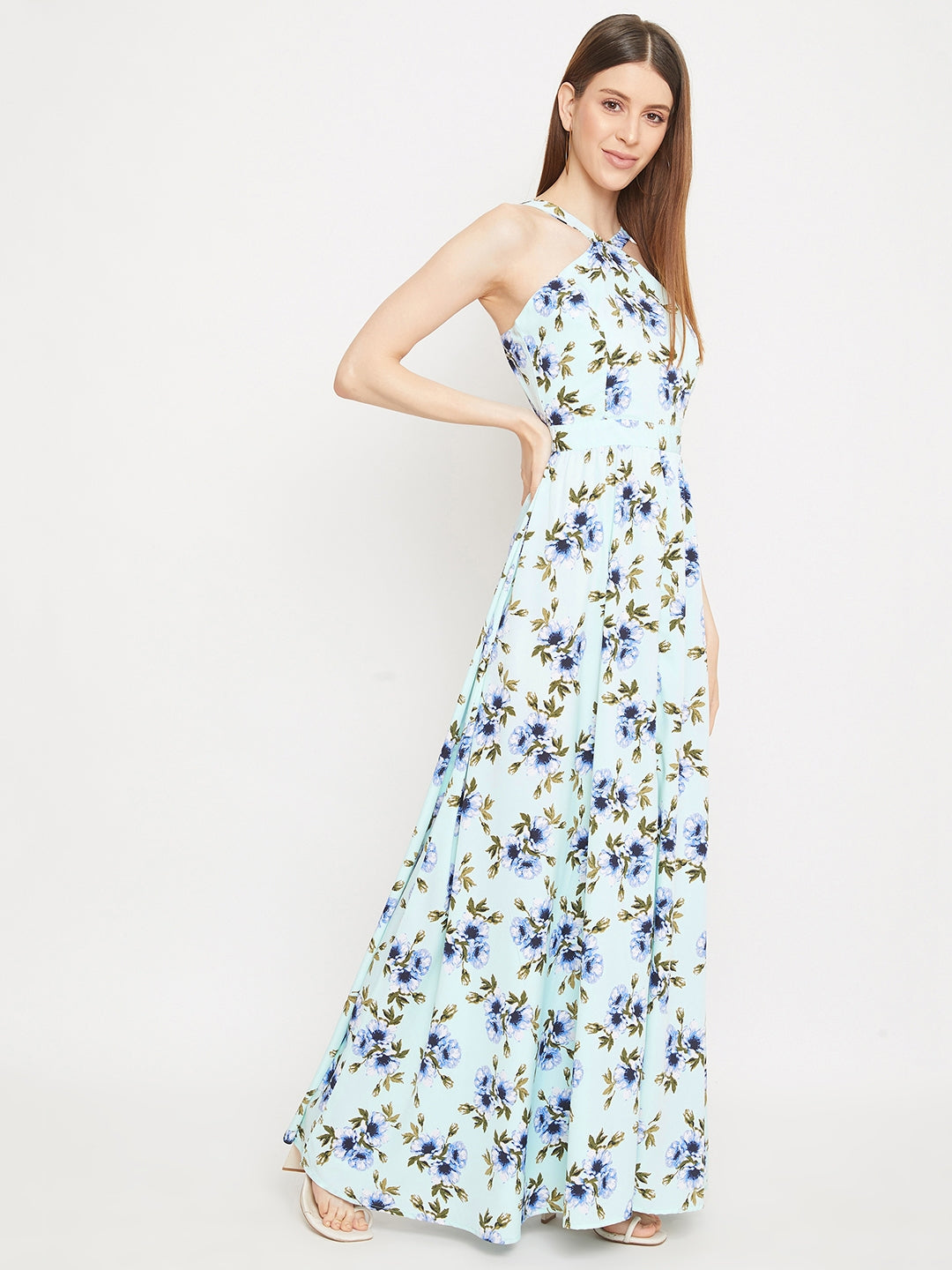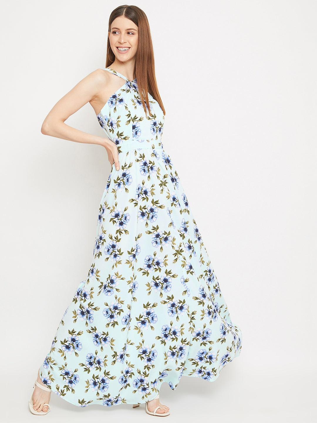 Berrylush Women Green Floral Print Halter Neck Flared Maxi Dress