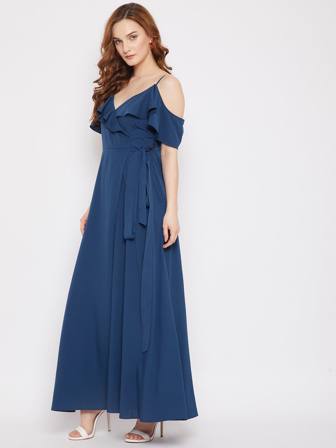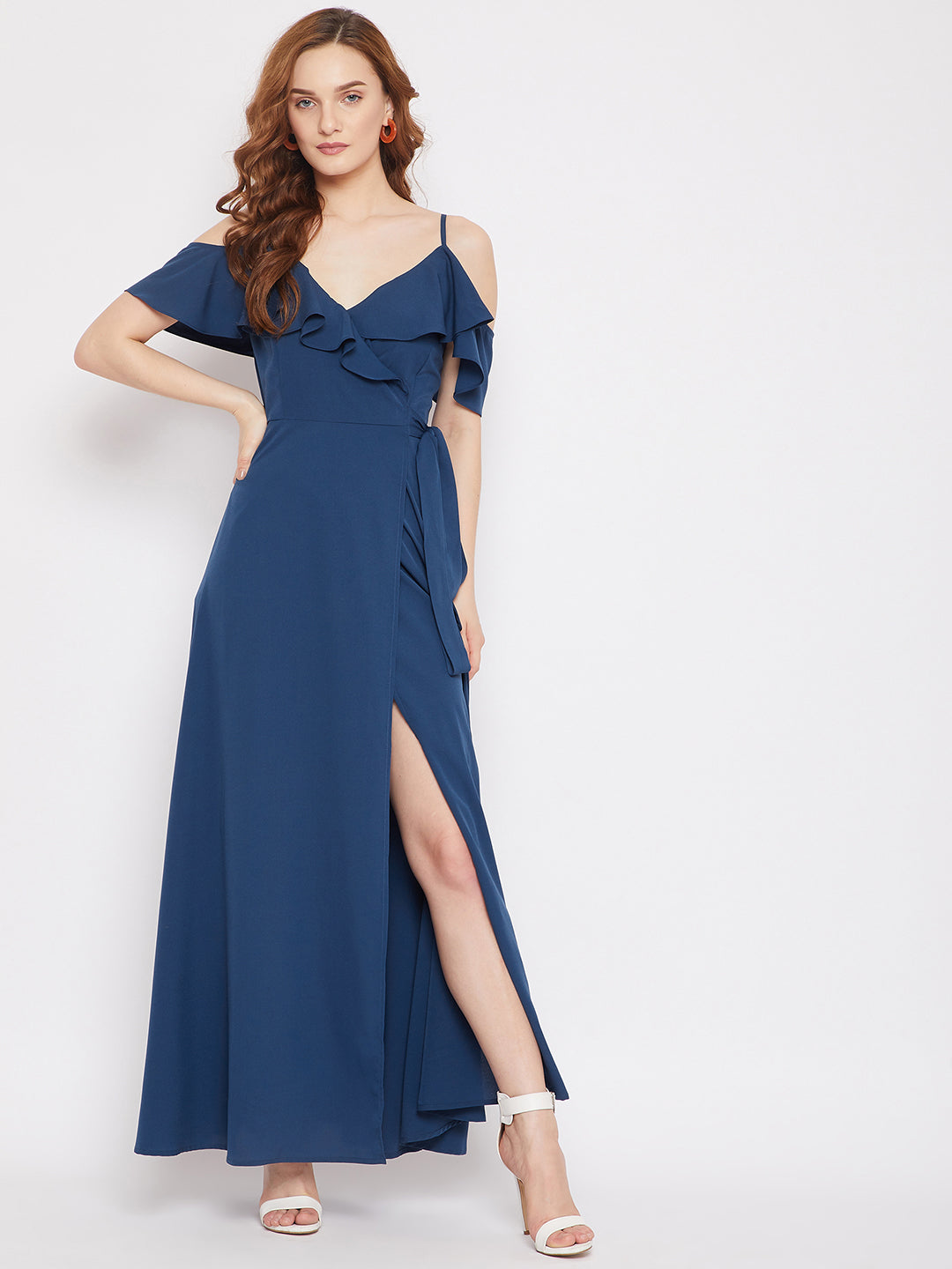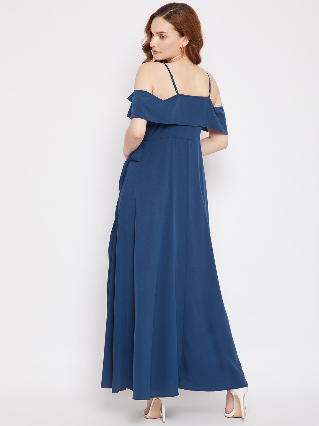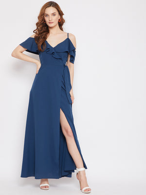 Berrylush Women Solid Blue V-Neck Cold-Shoulder Thigh-High Slit Ruffled Maxi Dress