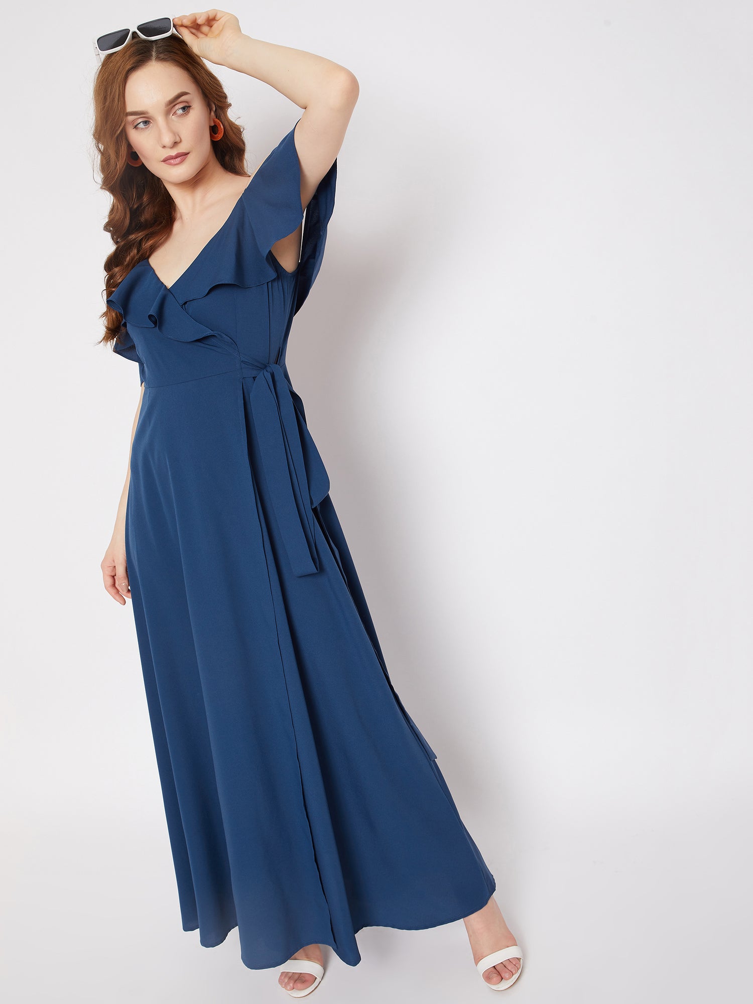 Uplift any casual events with undeniable sophisticated and imperial style by escorting yourself with this sassy Solid Blue V-Neck Cold-Shoulder Thigh-High Slit Ruffled Maxi Dress from Berrylush. The most elegant attribute of this maxi dress is its wrap shape which not only ensures an appropriate silhouette but also helps to hide bulges. Designed with short cold shoulder sleeves to define the practicality and versatility of this maxi dress. The flared hemline with front slit detailing lends a sexy yet smart appeal to your lower body portion. Match this astonishing flared maxi dress with a pair of high heels, a trendy clutch, and stylish jewellery for a mesmerizing look.