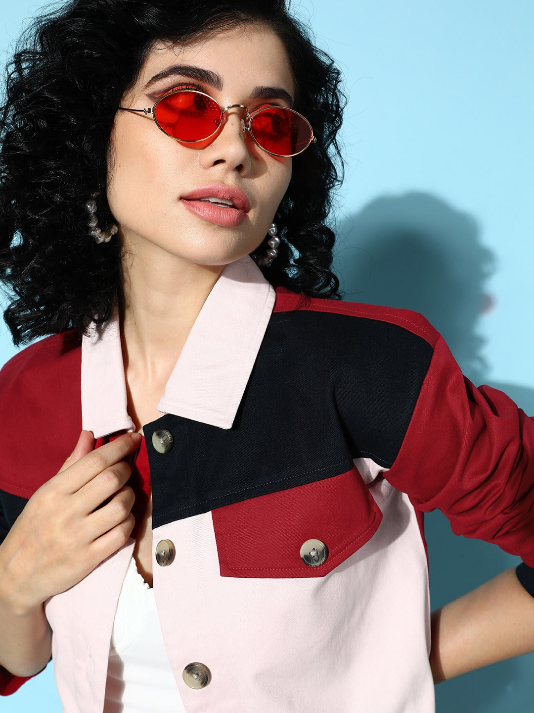 - Red, white, and black colour-blocked pattern gives this jacket a charming style