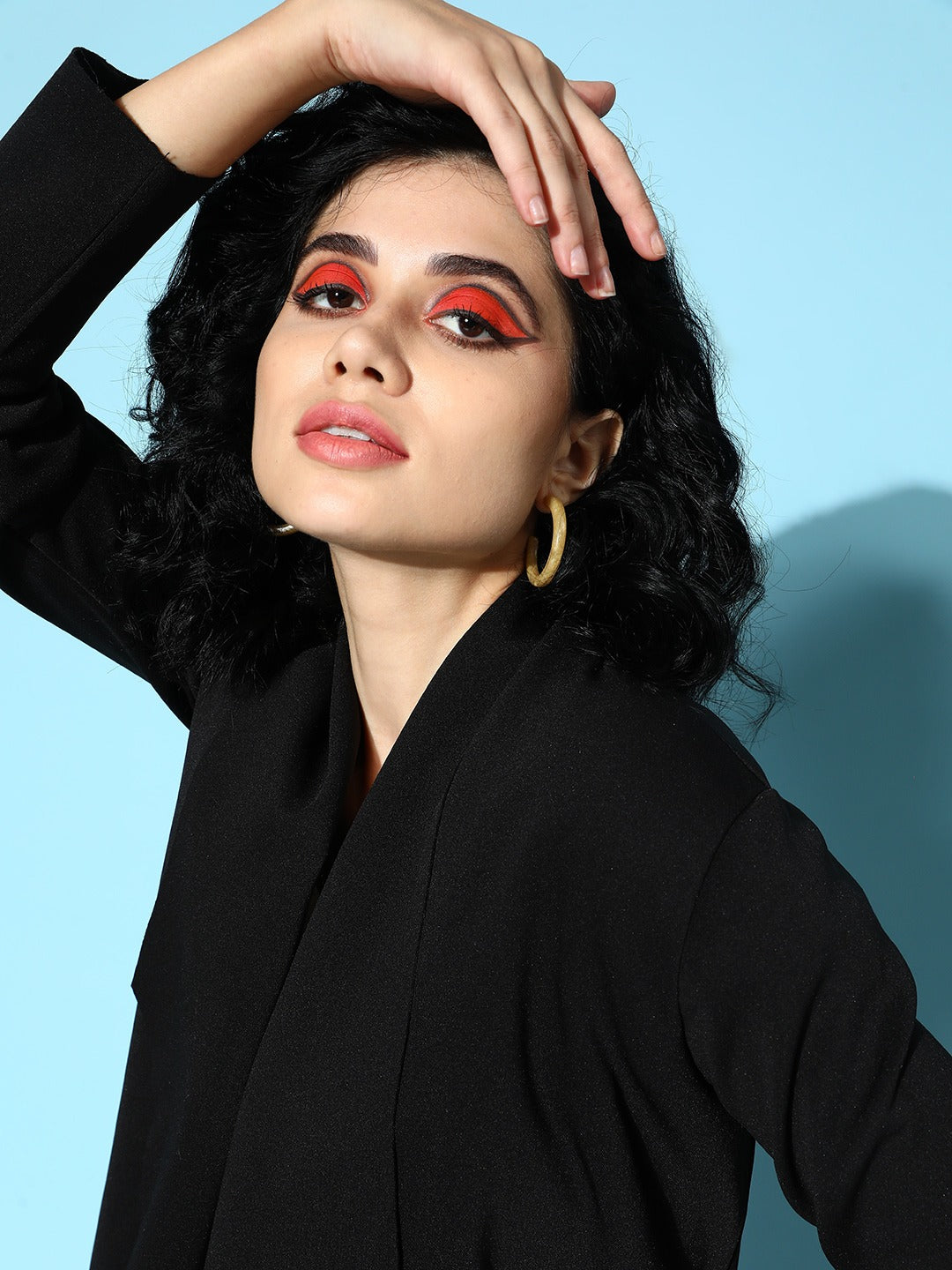 Searching for a classy and versatile addition to your layering assortment, then stop right here with this stunning Solid Black Waterfall Collar Asymmetrical Hem Regular Jacket designed by Berrylush. Fashioned with a charismatic combination of black shade and solid pattern that reflects your bold personality with an opulent appearance. Presenting regular length that makes this jacket appear modest and elegant with proper coverage to your upper body. The asymmetrical hemline lends this jacket a contouring silhouette to highlight your feminine figure with extra warmth to your body. Put it on with your tubeless top, brown parallel trousers, block heels, brown earrings, and a sling bag to get a fabulous look for any casual occasion.