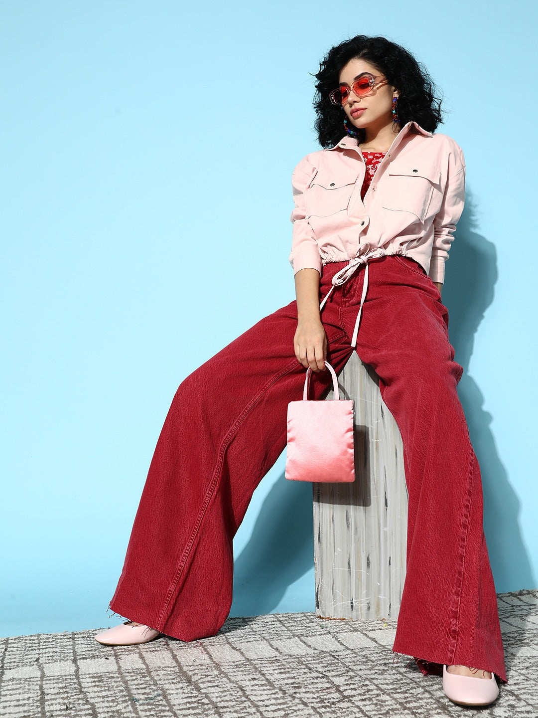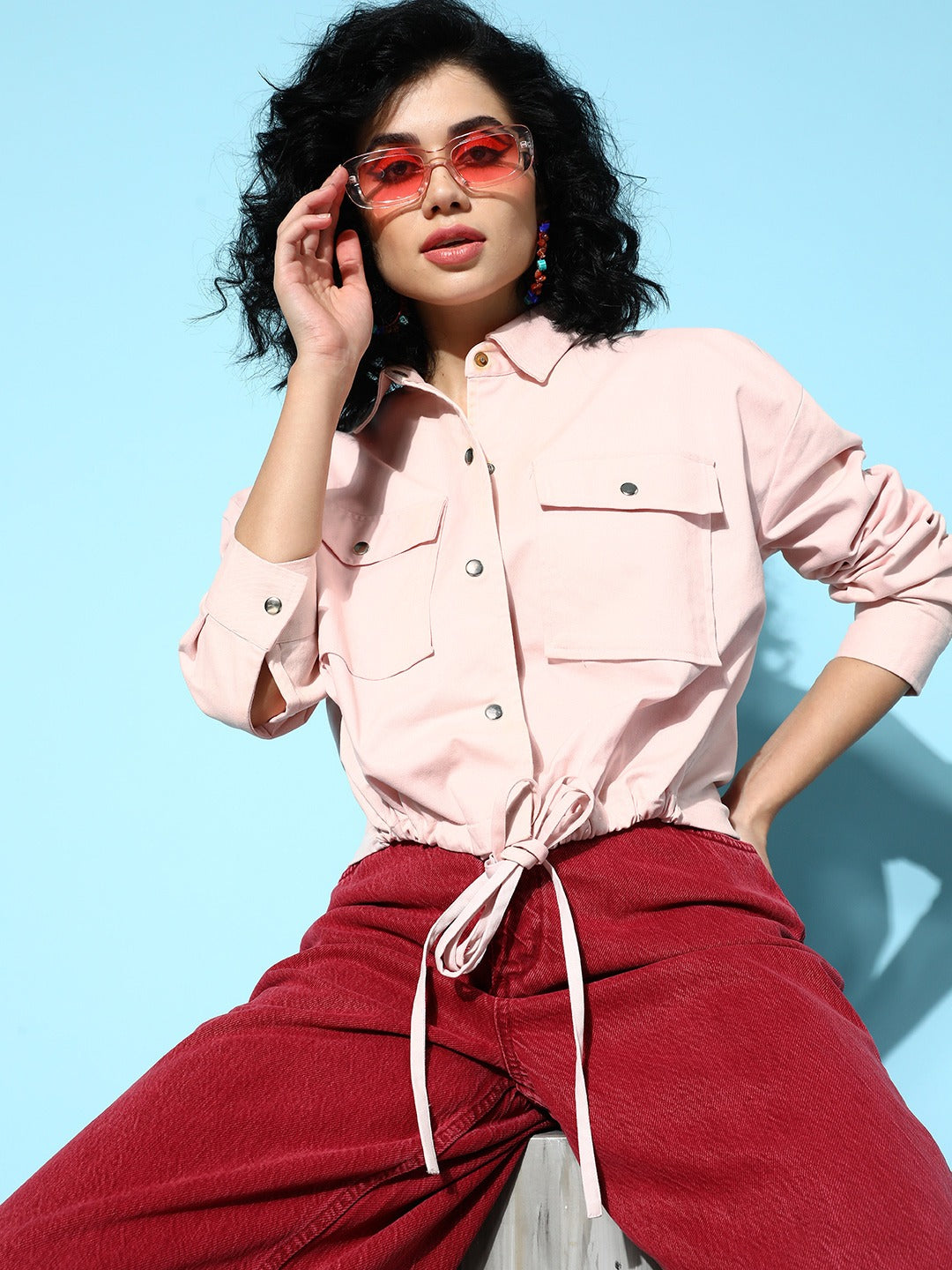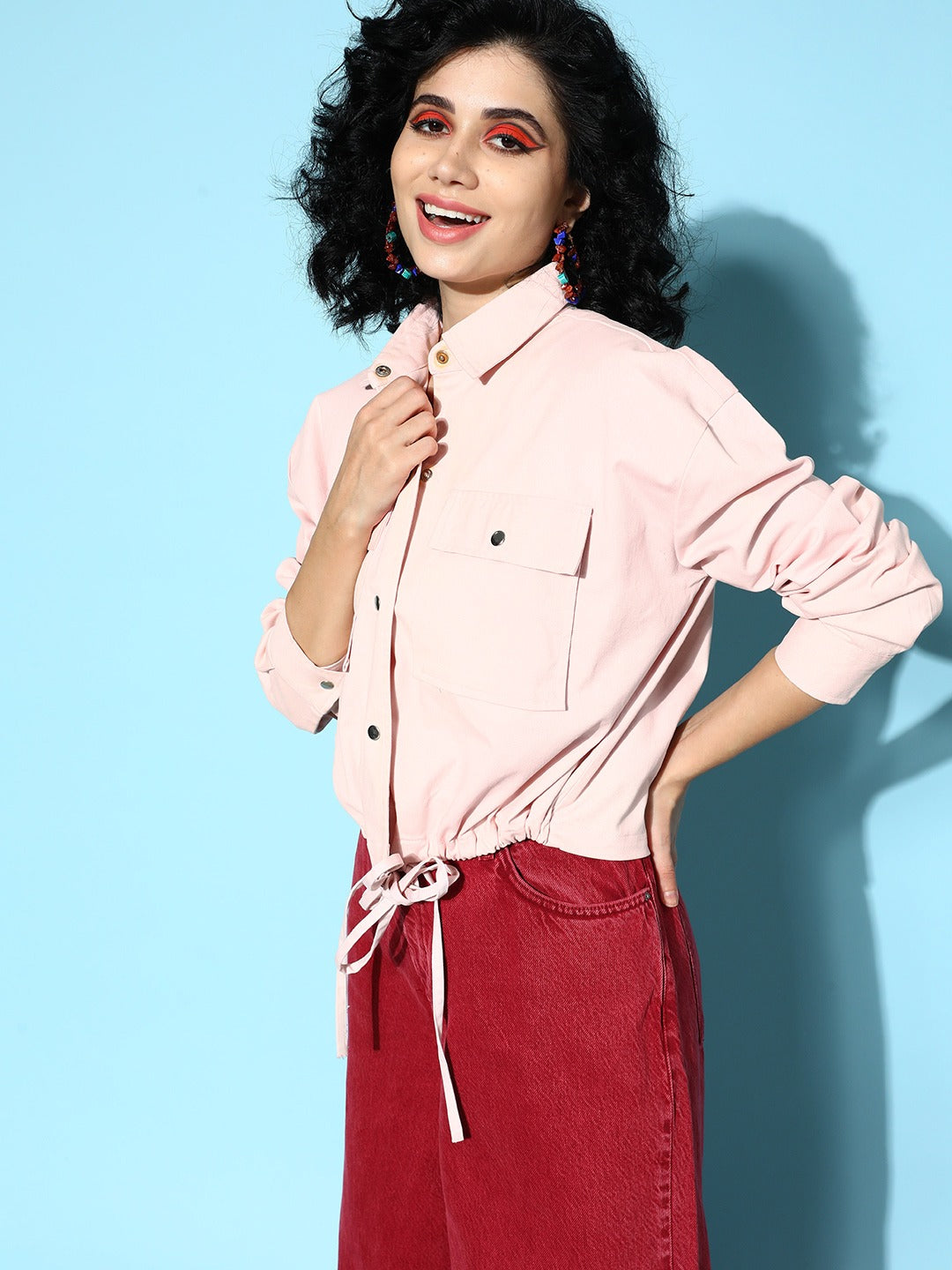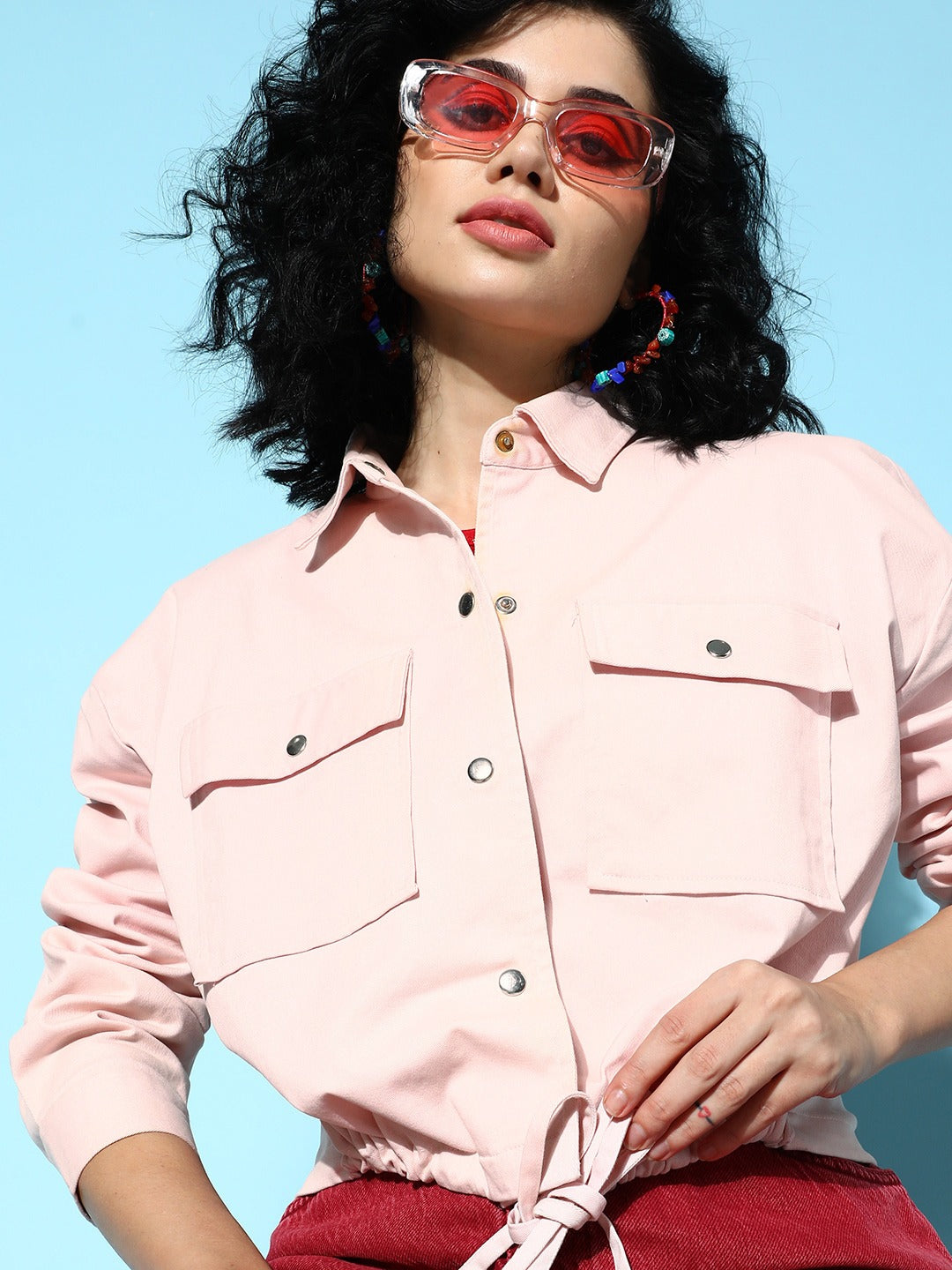 Berrylush Women Solid Pink Spread Collar Neck Front Snap-Button Cotton Straight Hem Regular Jacket