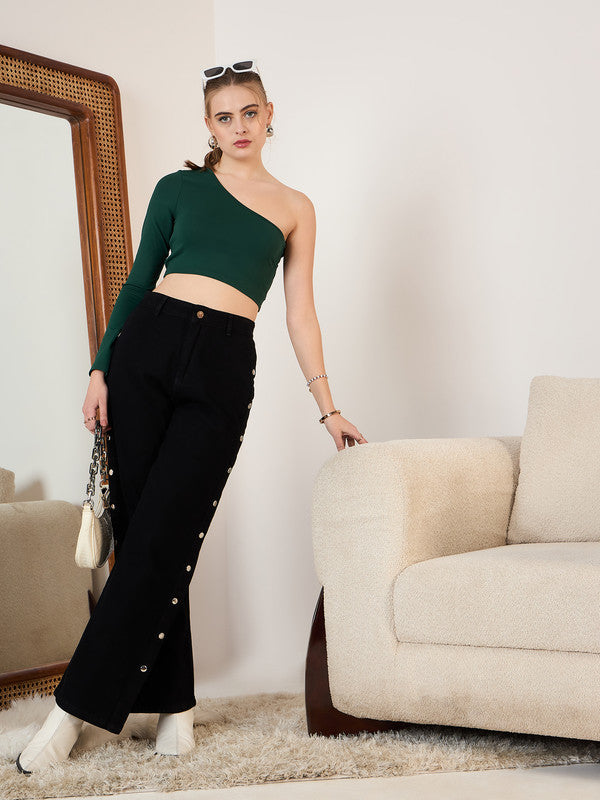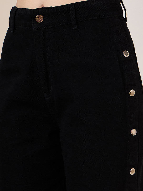 Berrylush Women Solid Black High-Rise Waist Four-Pocket Cotton Button Embellish Flared Regular Jeans