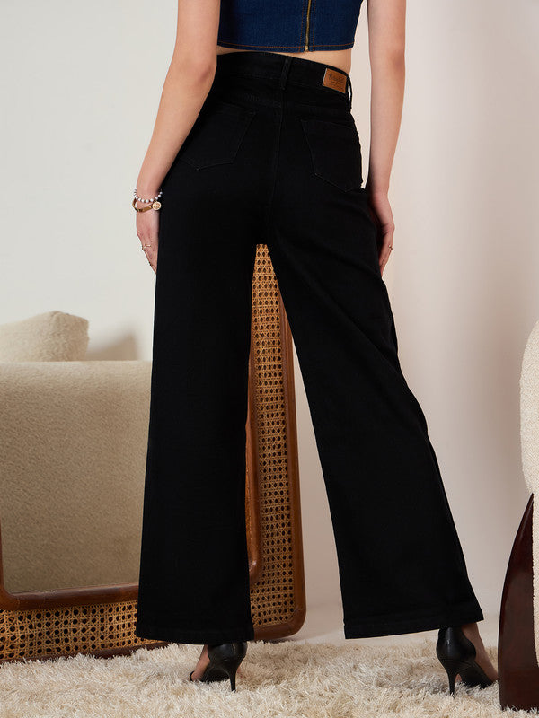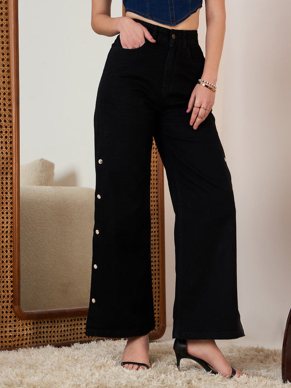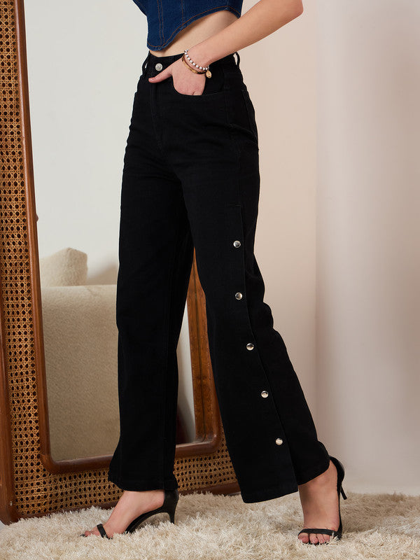 Berrylush Women Solid Black High-Rise Waist Four-Pocket Cotton Button Embellish Flared Regular Jeans