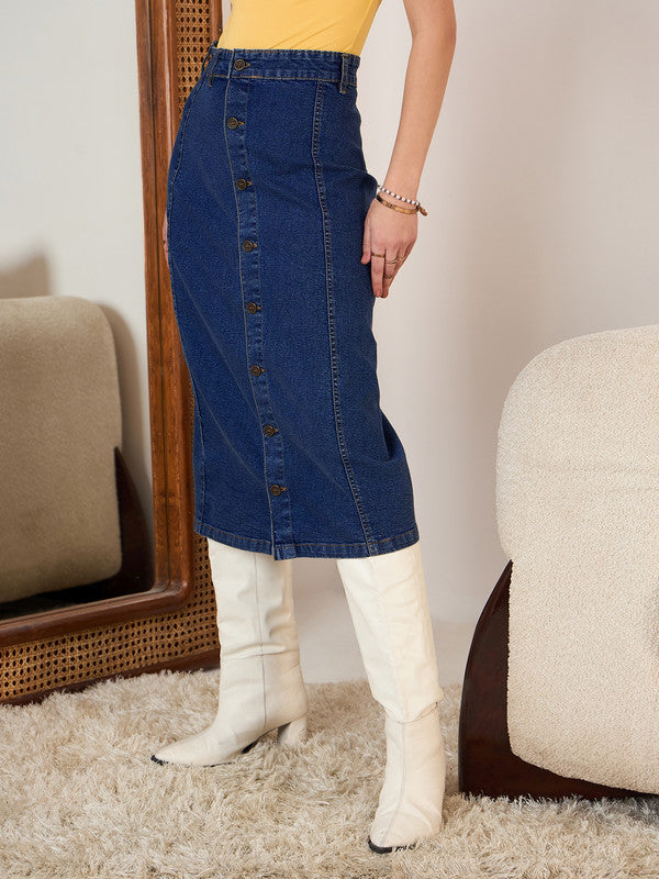 Berrylush Women Solid Blue High-Rise Waist Denim Button-Front Straight Hem Knitted Midi Skirt