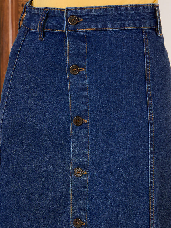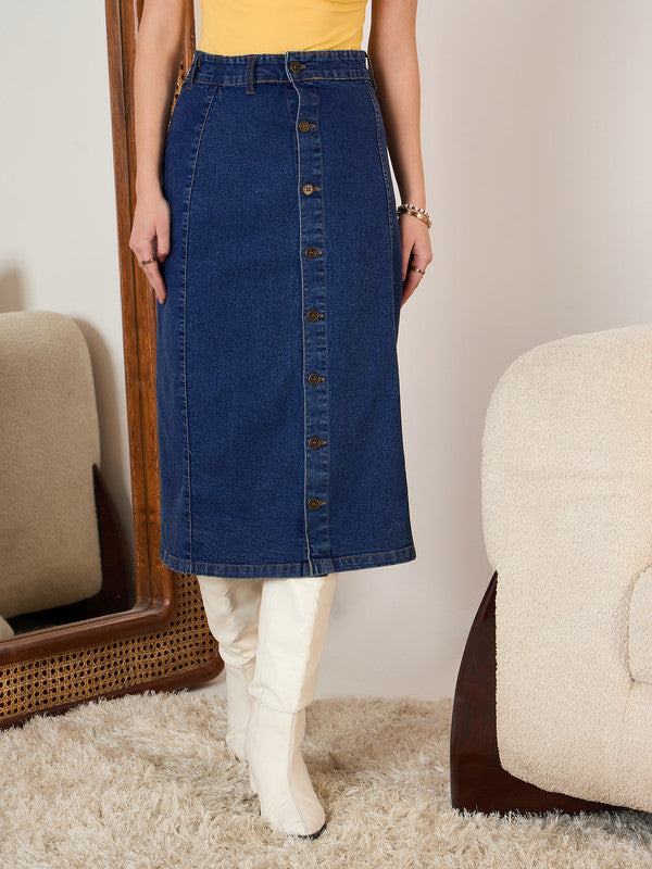 Introducing the Berrylush Solid Blue Denim Midi Skirt – your new go-to for effortless style! Crafted from comfortably soft, knitted denim fabric, this skirt features a high-rise waist with belt loops to flatter all body types. Its solid blue colour provides versatile styling options while offering full coverage with an opaque finish. The straight hem and front button closure add classic touches to its trendy midi length, making it perfect for any casual occasion. Elevate your wardrobe with this chic and timeless piece from Berrylush.