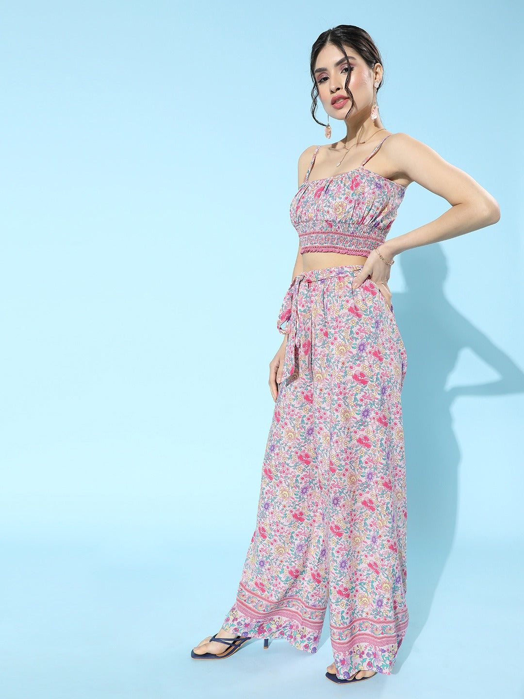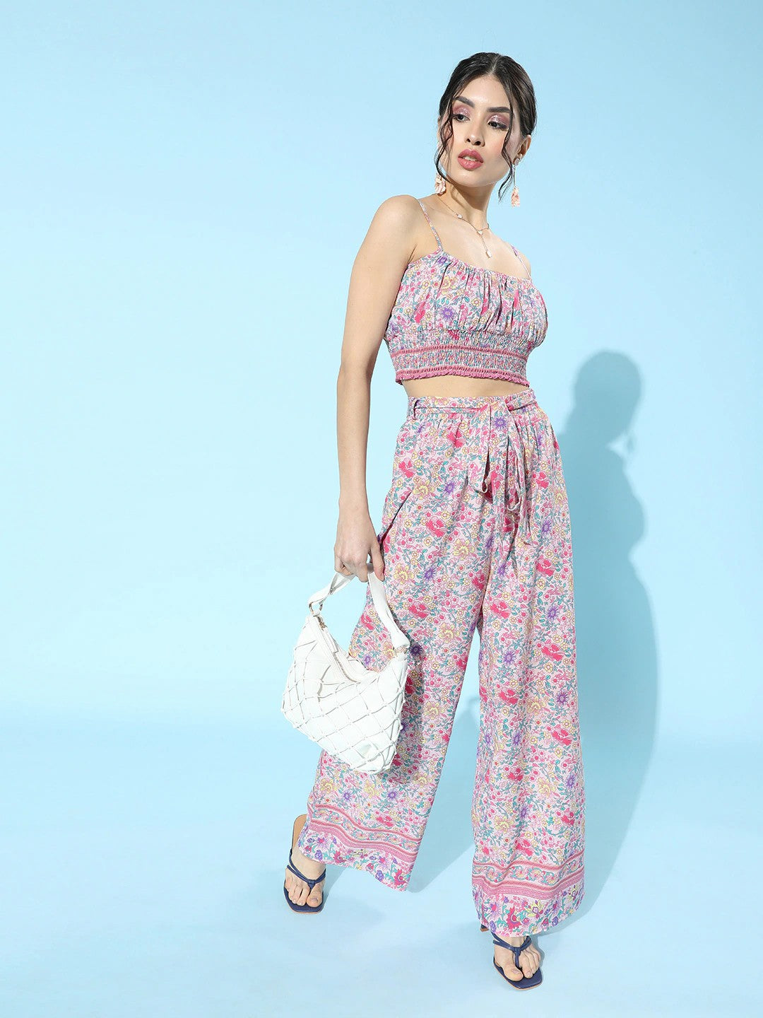 Berrylush Women Pink Floral Printed Square Neck Cami Top & Wide-Leg Trousers Set