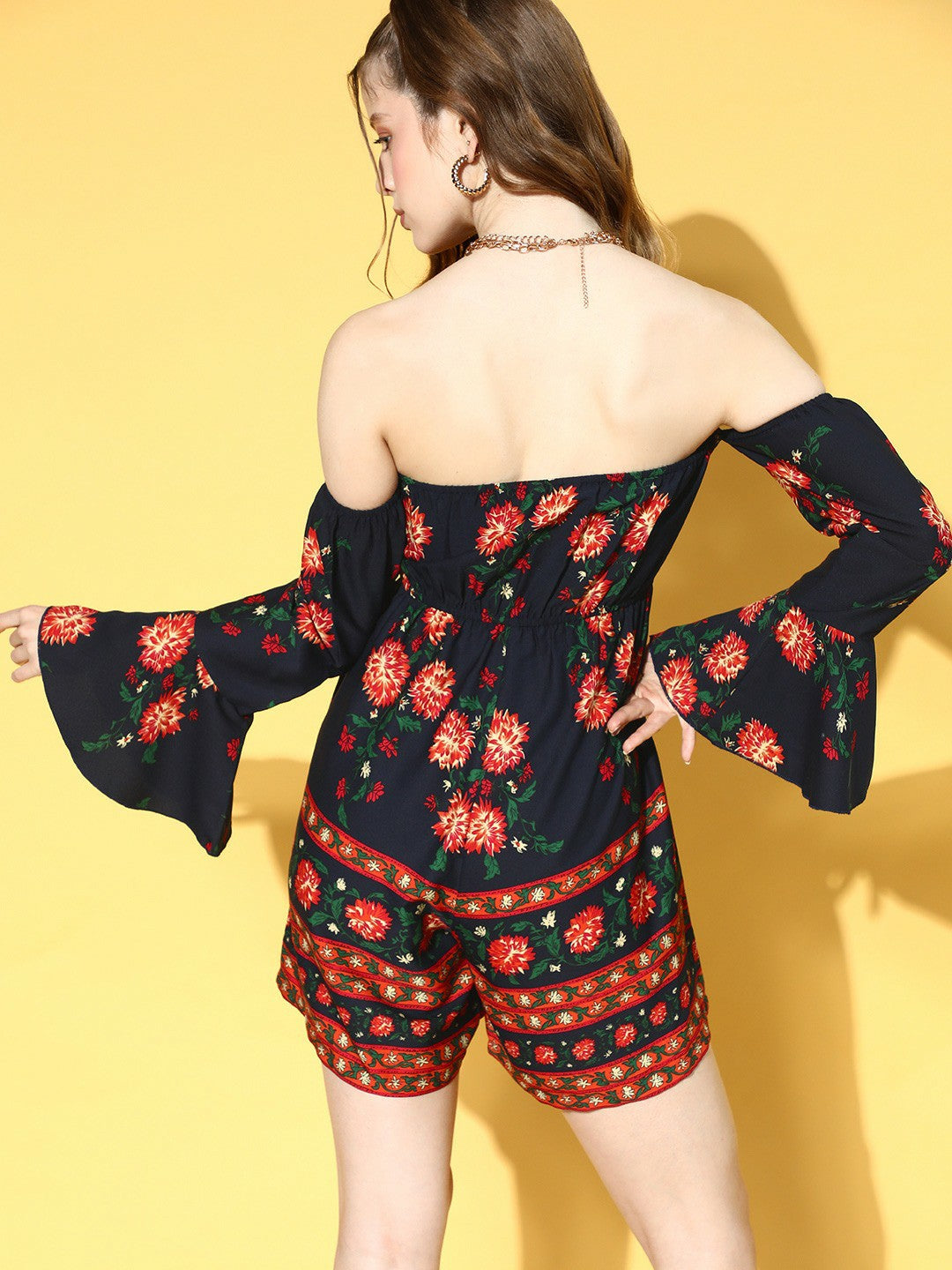 Berrylush Women Navy Blue & Orange Floral Printed Strapless Neck Mini Playsuit