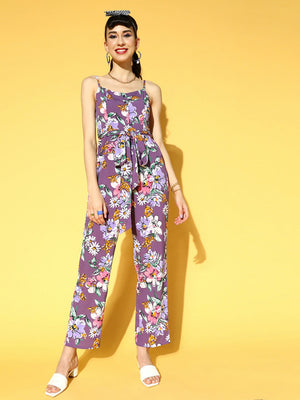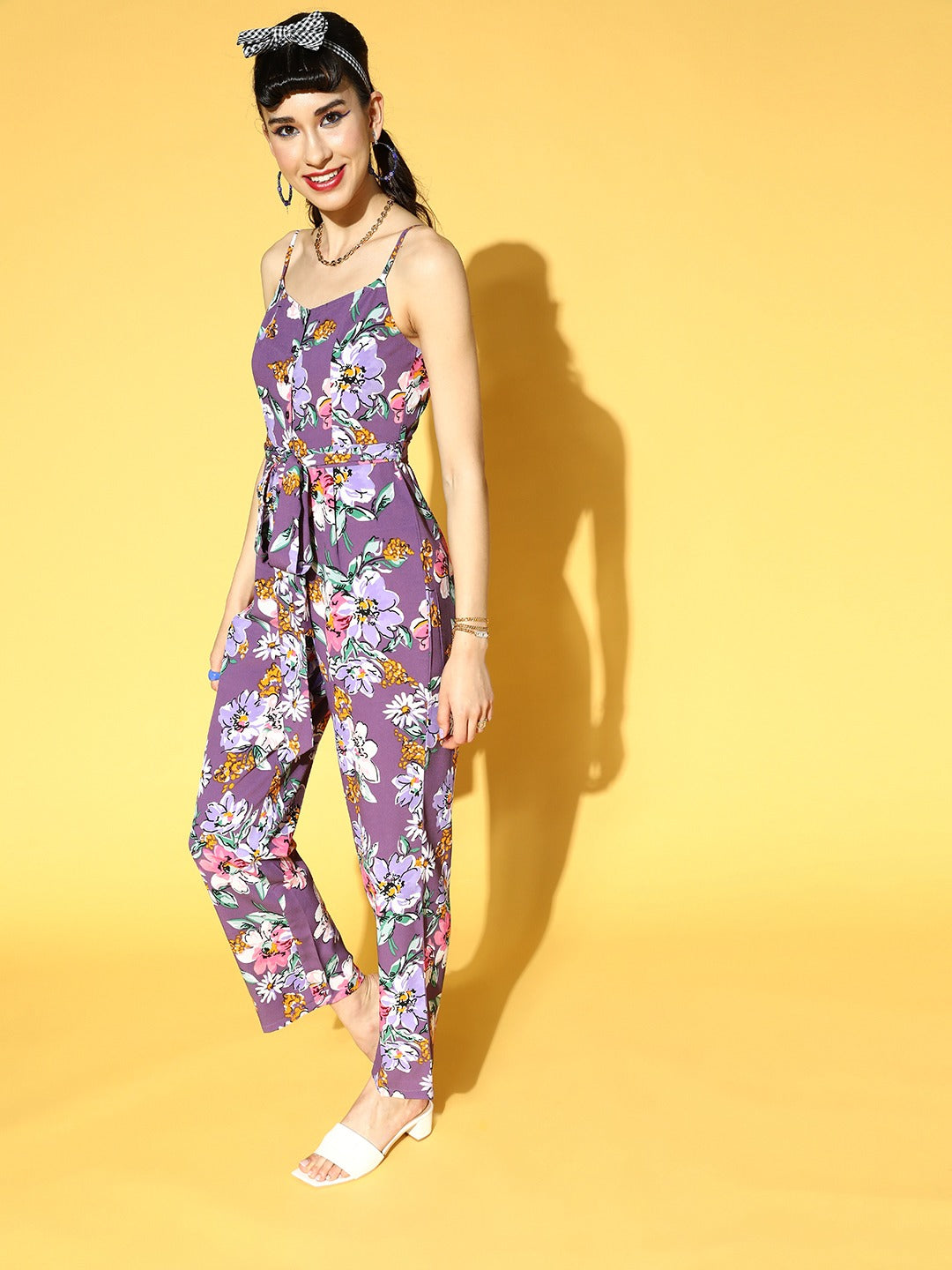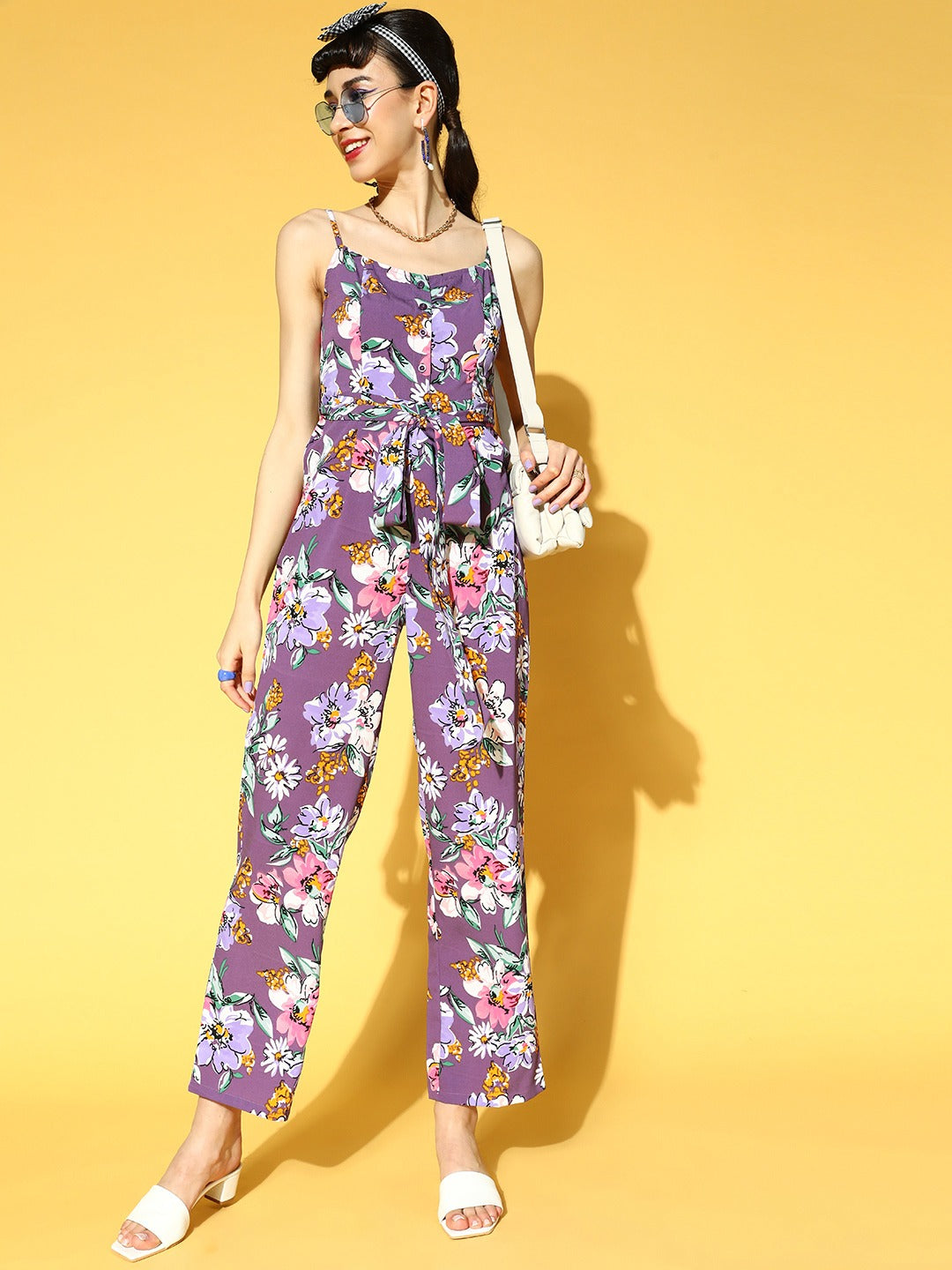 Berrylush Women Purple & Pink Floral Printed V-Neck Waist Tie-Up Style Back Basic Jumpsuit