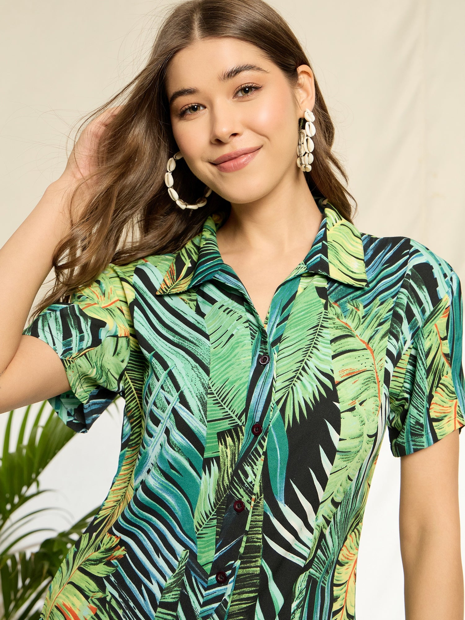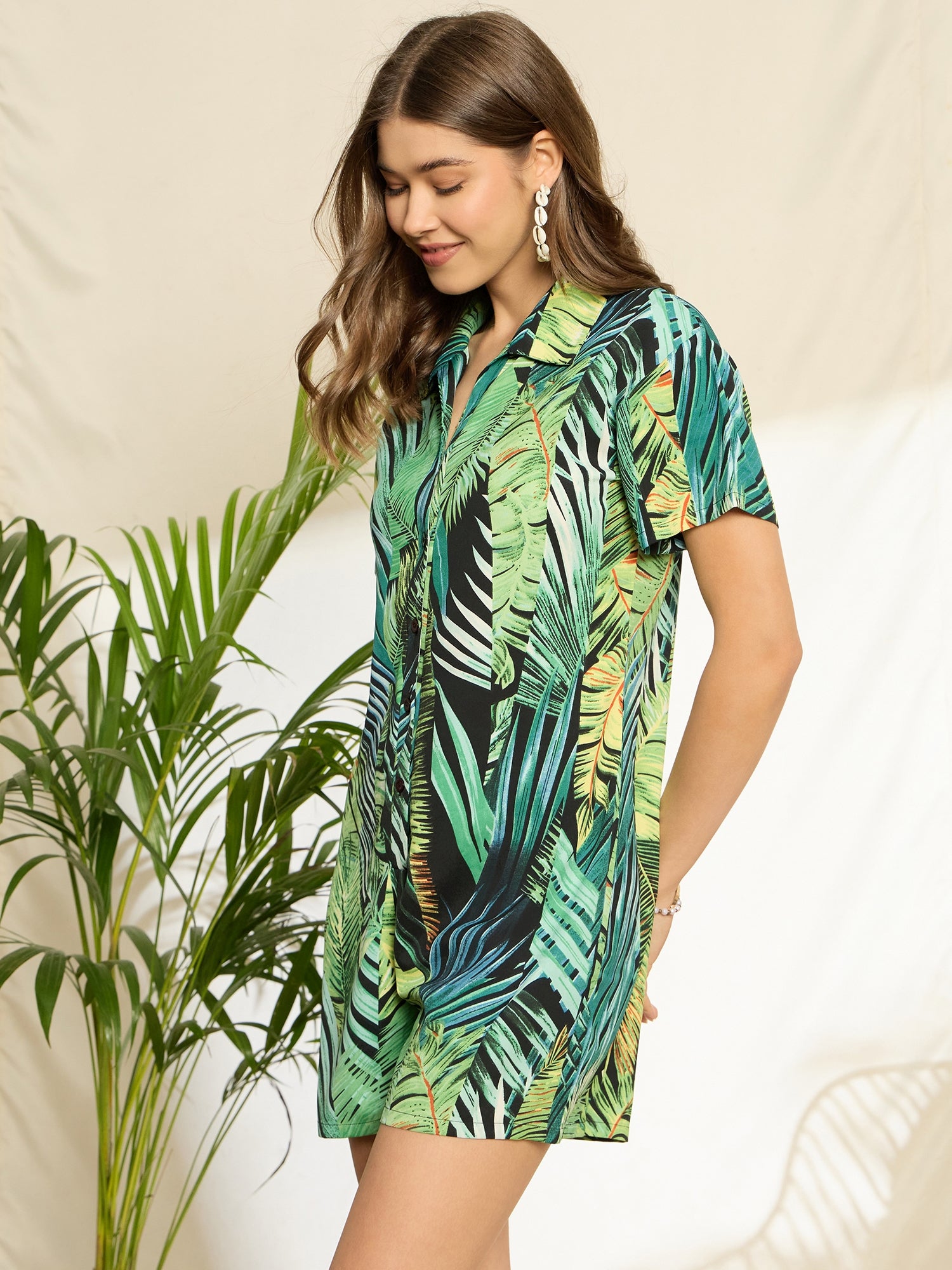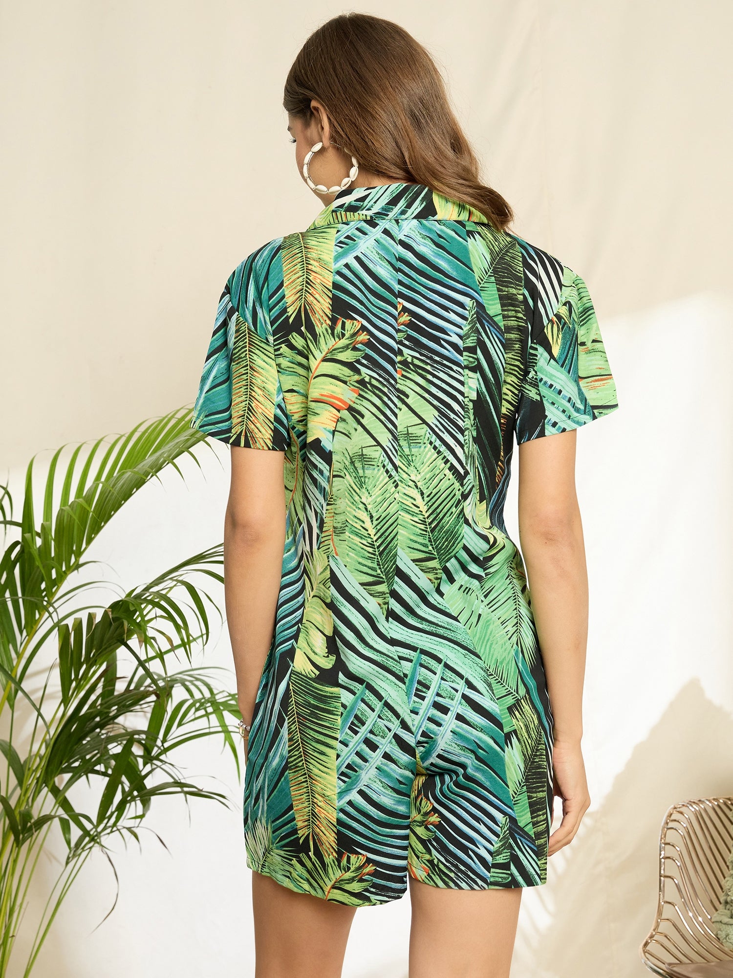 Berrylush Women Black & Green Tropical Printed Spread Collar Neck Short Sleeves Front Button-Up Straight Hem Mini Jumpsuit