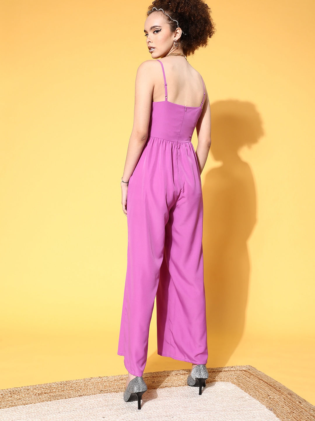 Berrylush Women Solid Lavender Round Neck Sleeveless Gathered Jumpsuit