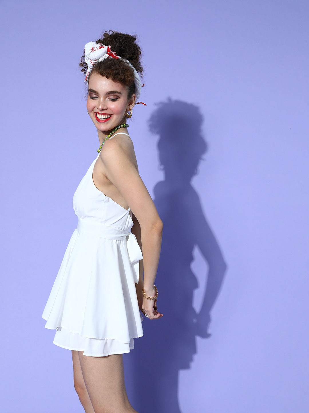 Hype your summer style with must-have flowy profile outfit options just like this dazzling Solid White V-Neck Waist Tie-Up Backless Smocked Layered Mini Playsuit from Berrylush. Presenting a tie-up feature at the back of this jumpsuit that cinches your waist in for a beautiful and flattering frame. Fashioned with a deep V-neck design that gives your neckline an exotic appearance with enhanced breathability. That's not all, this jumpsuit is designed with adjustable shoulder straps that reduce the stress of the outfit on your back with a comfortable silhouette. Team up this layered jumpsuit with classy black loafers, a stylish beads necklace, and a checked-style handbag to get a fascinating appearance.